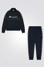 חליפת פוטר לגברים מבית המותג CHAMPION, בצבע נייבי, מחממת ונעימה , סווטשירט עם לוגו המותג, סגירת רוכסן עם צווארון גבוהה ושני כיסים צדדיים, ומכנסיים עם מותן אלסטית וסיומת גומי ברגליים.
