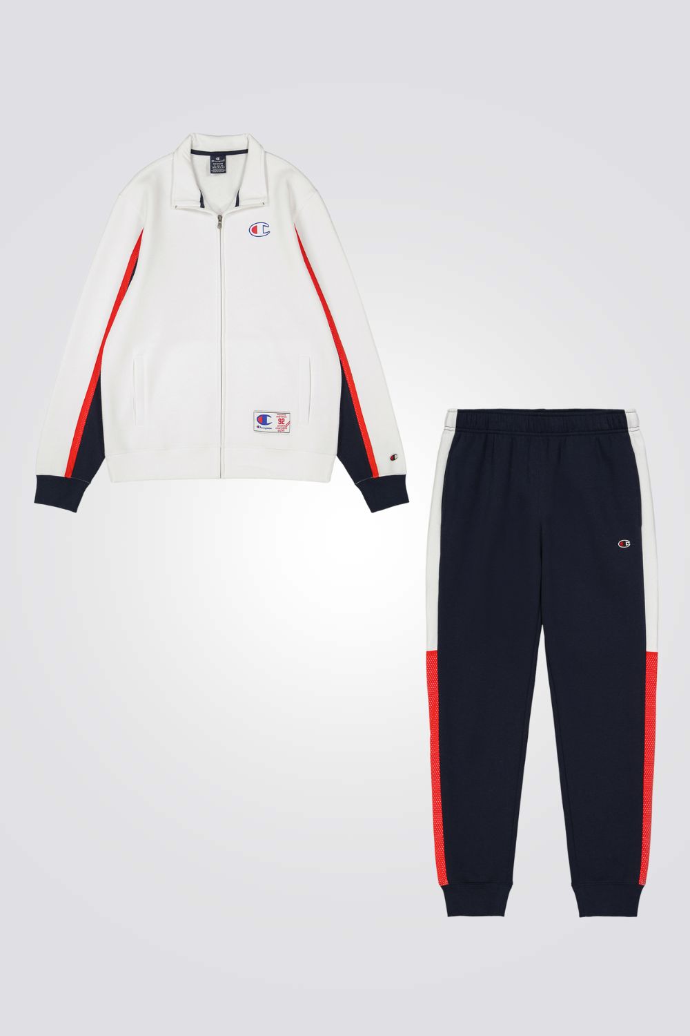 חליפה לגבר מבית המותג CHAMPION, סווטשירט עם רוכסן וצווארון גבוהה, לוגו המותג ושני כיסים צדדיים, ומכנסיים עם מותן אלסטית וסיומת גומי.