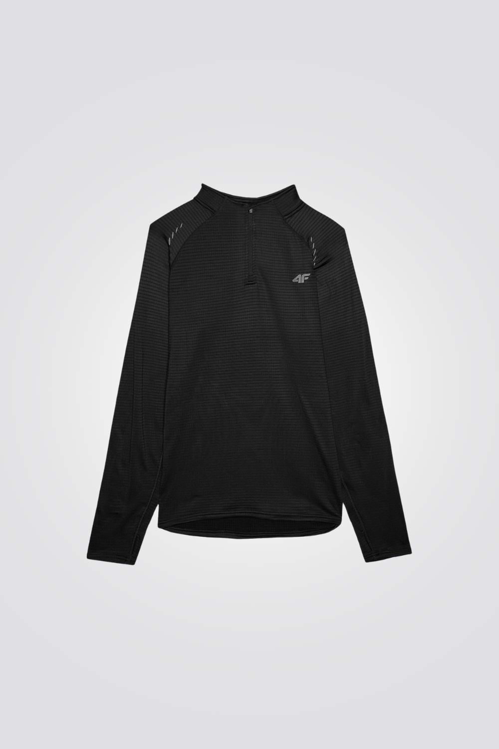 חולצה ארוכה לגברים מבית המותג 4F, בצבע שחור, מתאימה לאימונים ומנדפת זיעה ,עם שרוולים ארוכים וצווארון עגול וסגירת רוכסן .