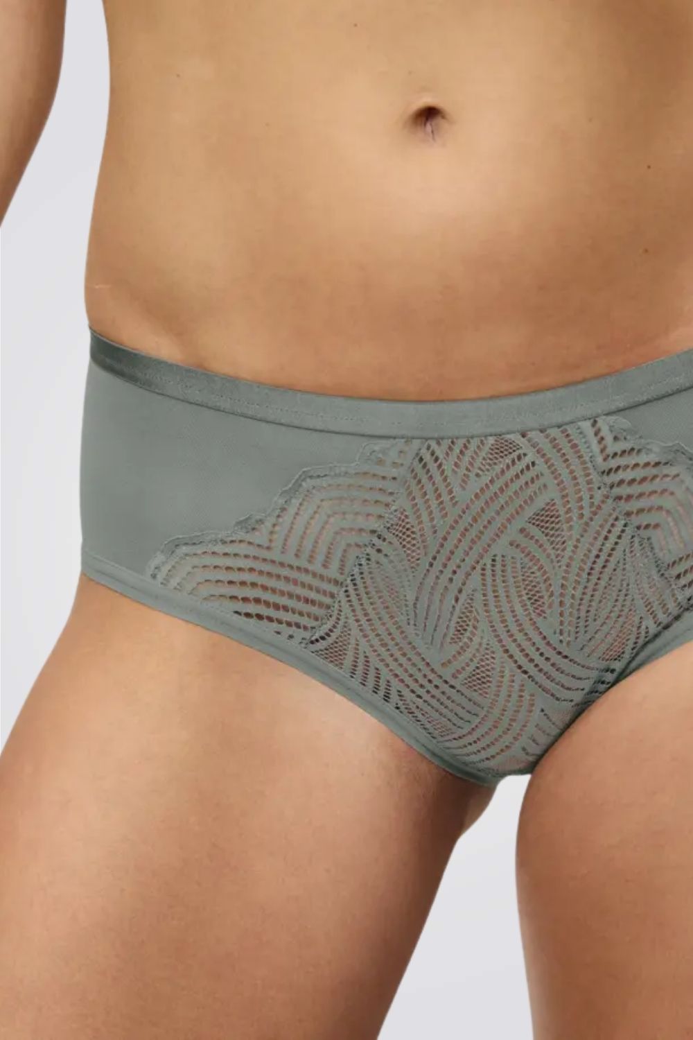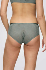 תחתוני היפסטר מבית המותג TRIUMPH בעלי כיסוי בינוני, משלבים תחרה מעודנת גמישה ואלסטית עם רצועת מותן דקיקה.