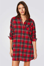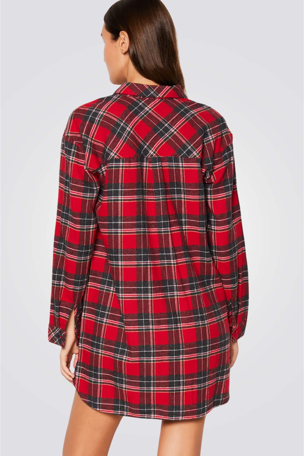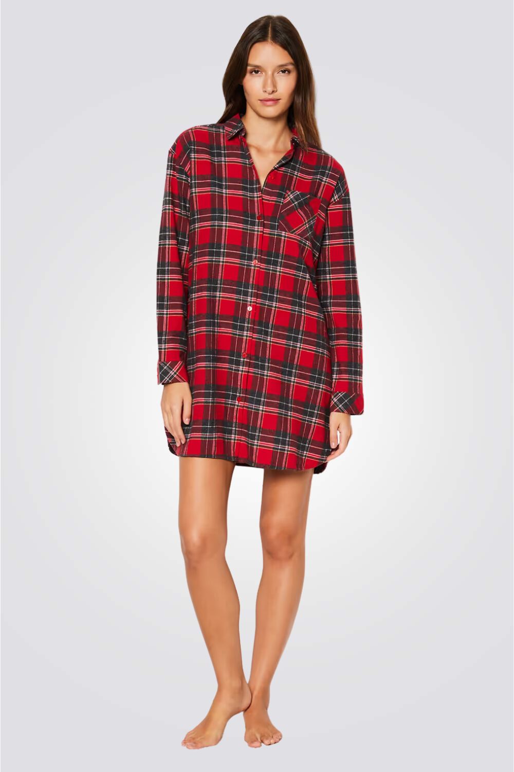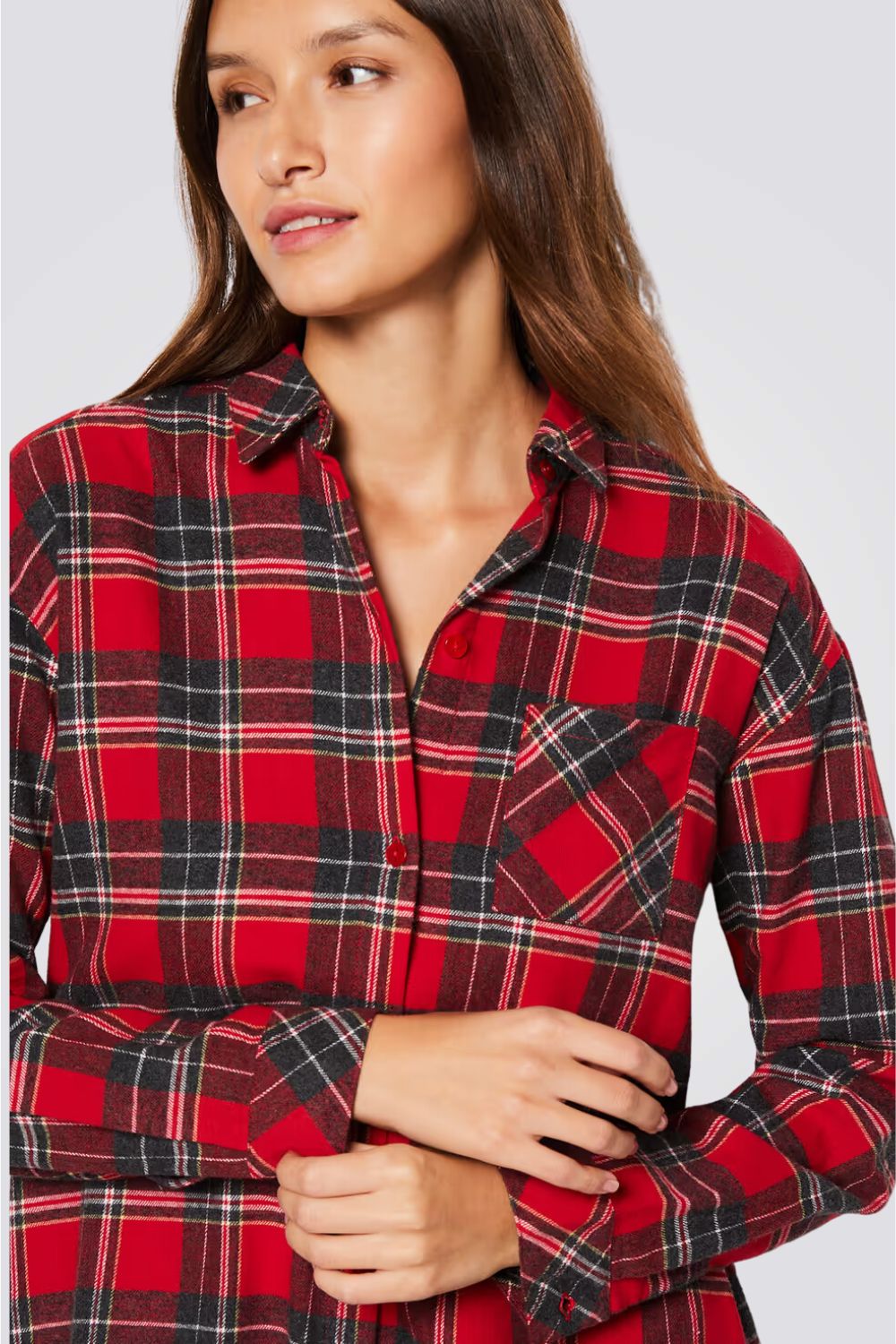 כותונת לילה מבית המותג הצרפתי ETAM, עשויה מכותנה רכה ונעימה, בהדפס משובץ עם סגירת כפתורים ושרוולים ארוכים.