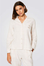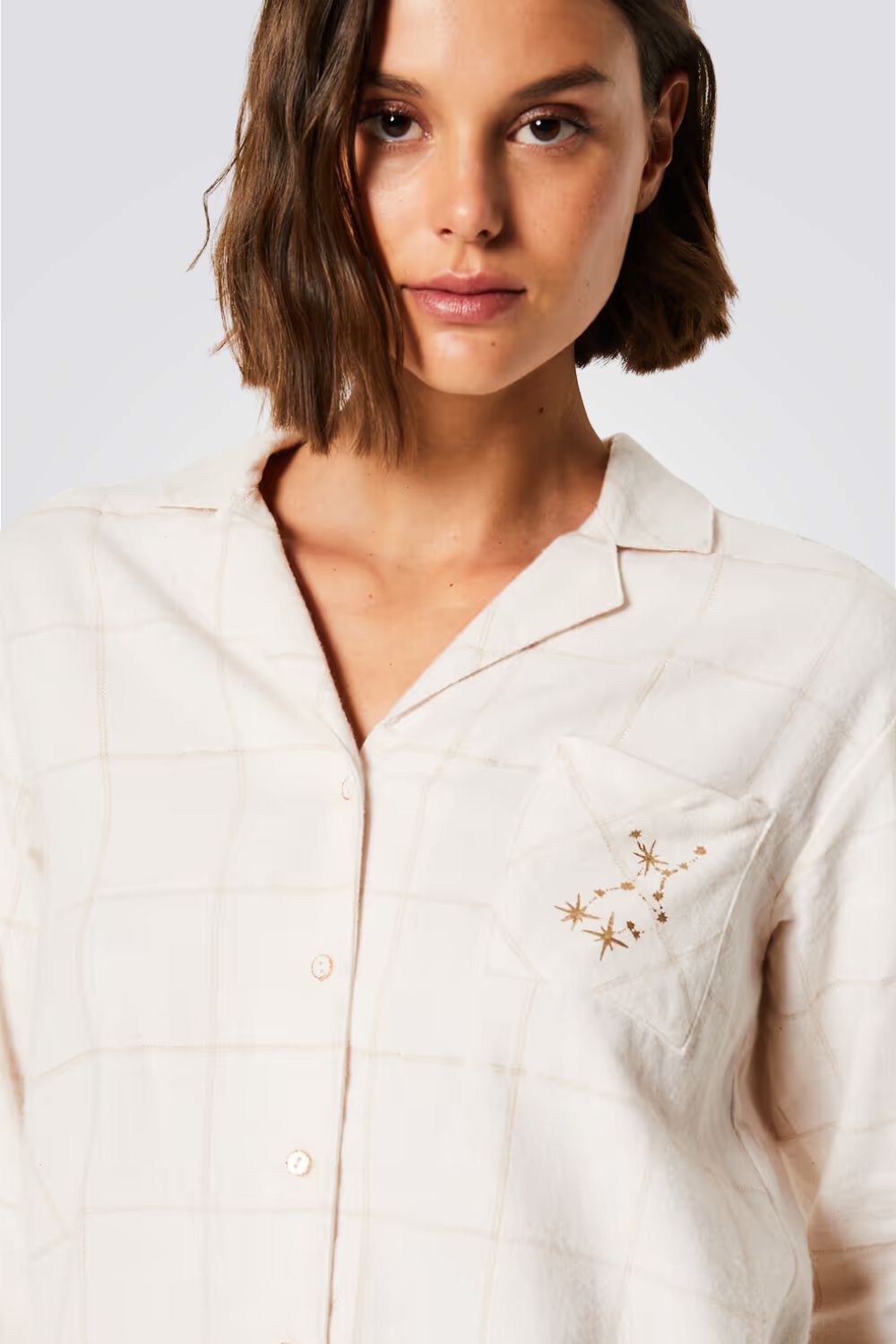 חולצת פיג'מה מכופתרת מבית המותג ETAM בעלת כיס קידמי קטן עם רקמת כוכבים, שרוולים ארוכים וצווארון דש.