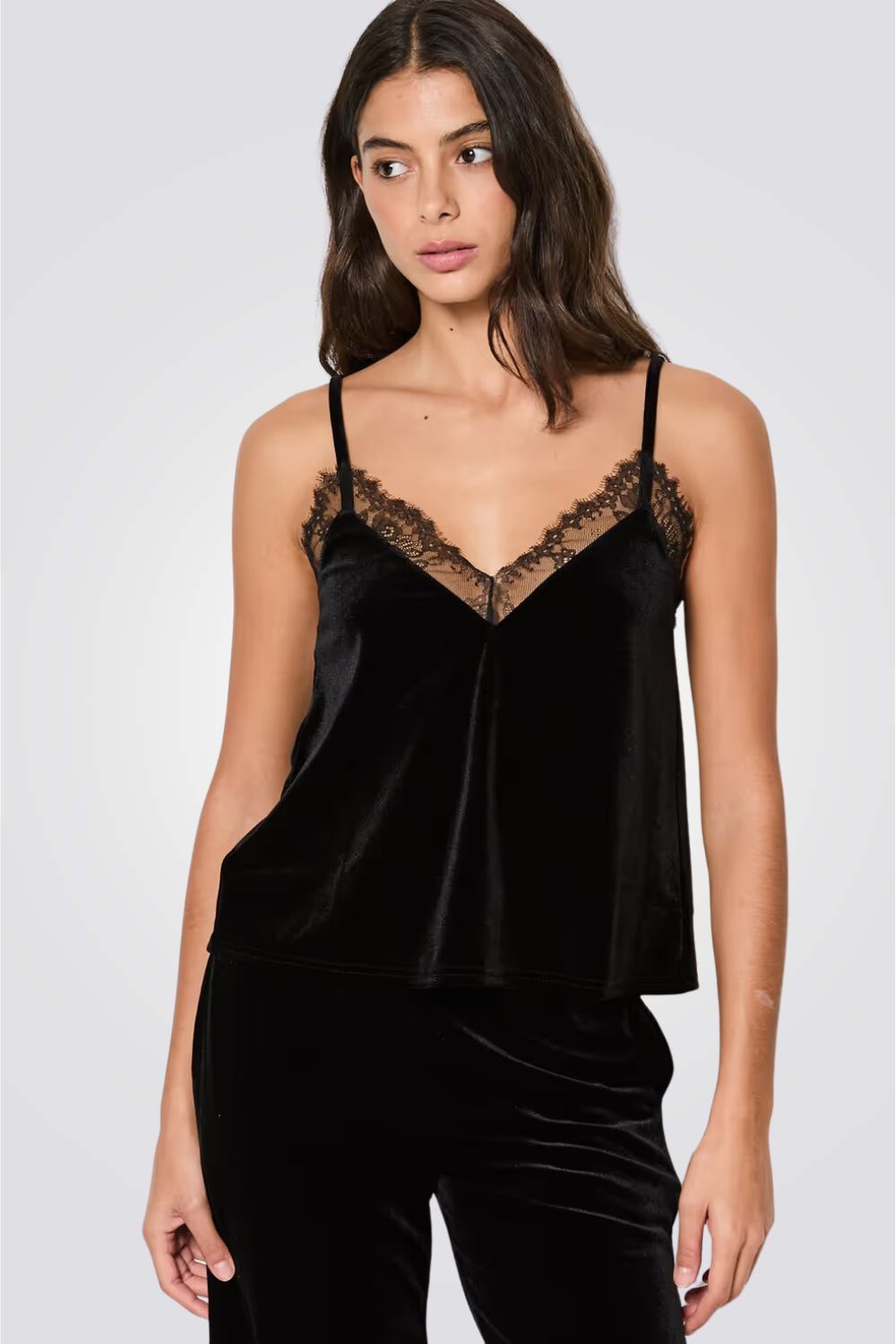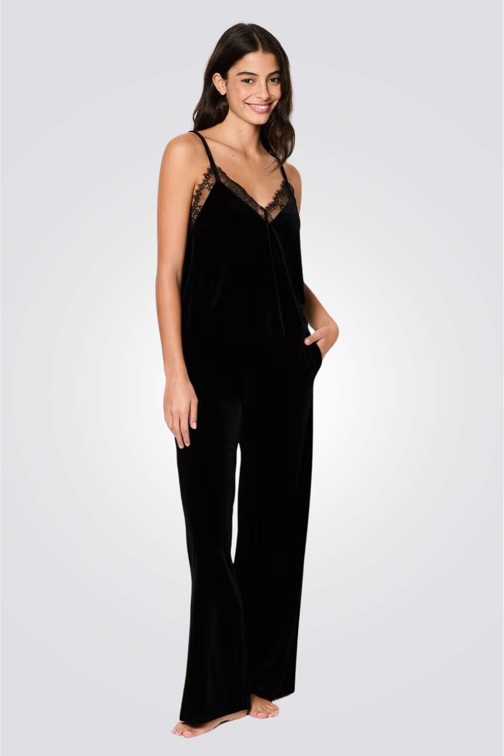 גופיית פיג'מה ארוכים מבית המותג ETAM, העשויה בד קטיפה רך ובעלקו צוואר מעוטר בתחרה פרחונית עדינה ומפתח גב מרובע.