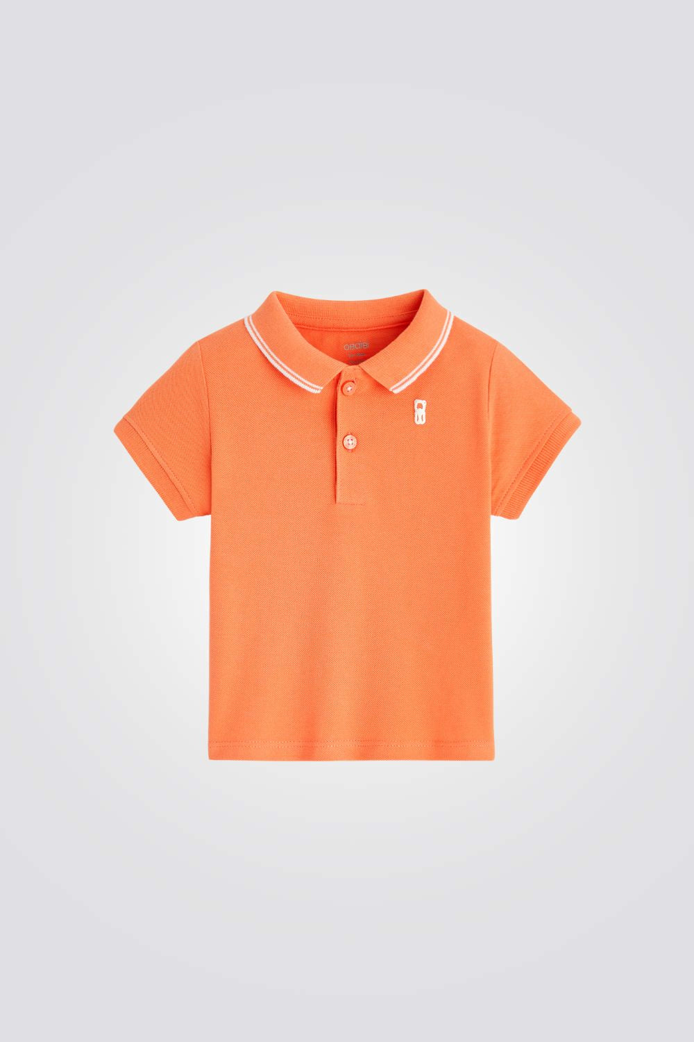 חולצת פולו לתינוקות מבית המותג OBAIBI, בצבע כתום , עשויה מכותנה בדוגמת סריג פיקה, צווארון פולו עם פס לבן עדין, פתיחה עם שלושה כפתורים, ולוגו קטן על החזה