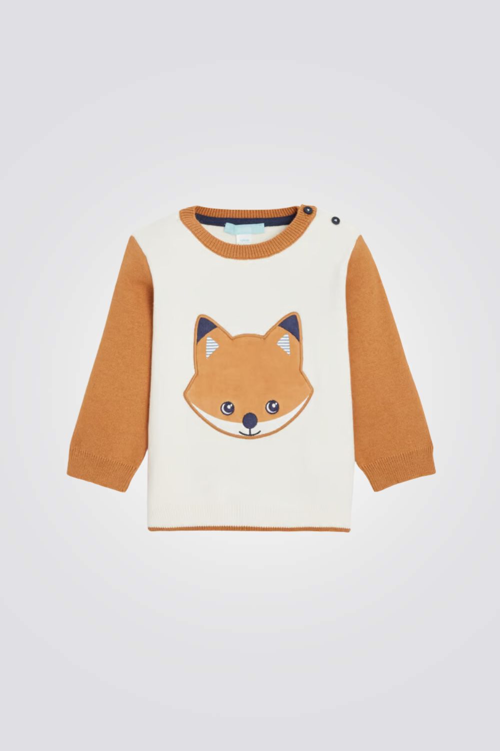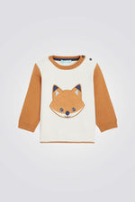 סווטשירט לתינוקות מבית המותג OBAIBI, עם הדפס שועל , צוואקרון עגול ושרוולים אורכים, וסגירת תיקתק בכתף.