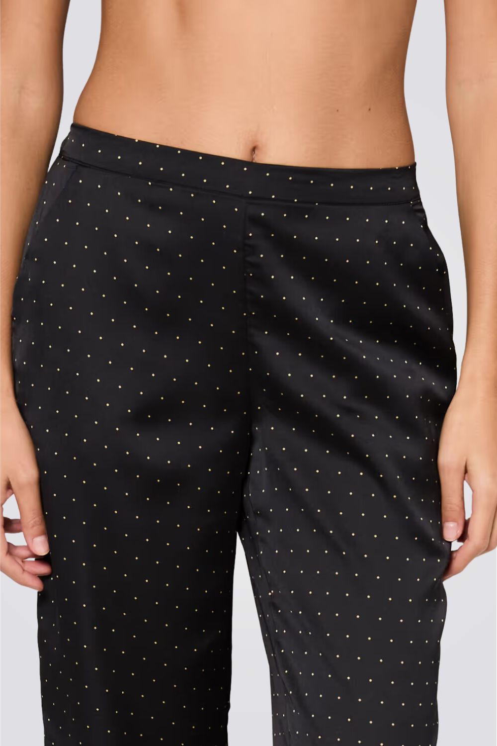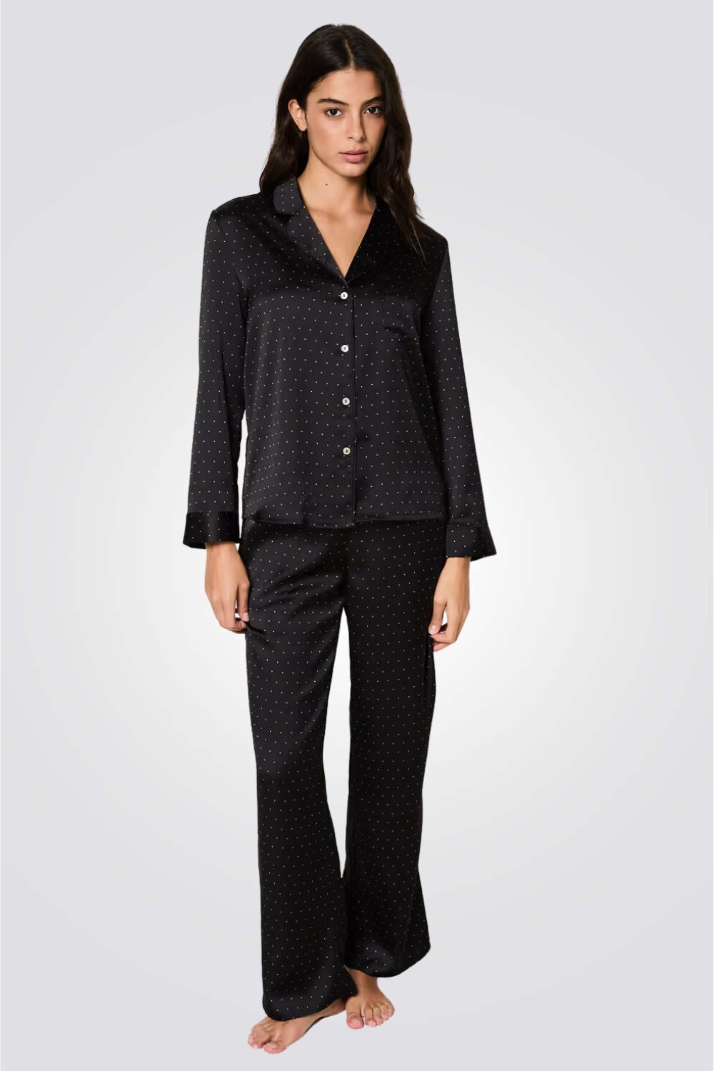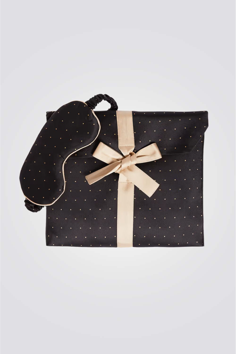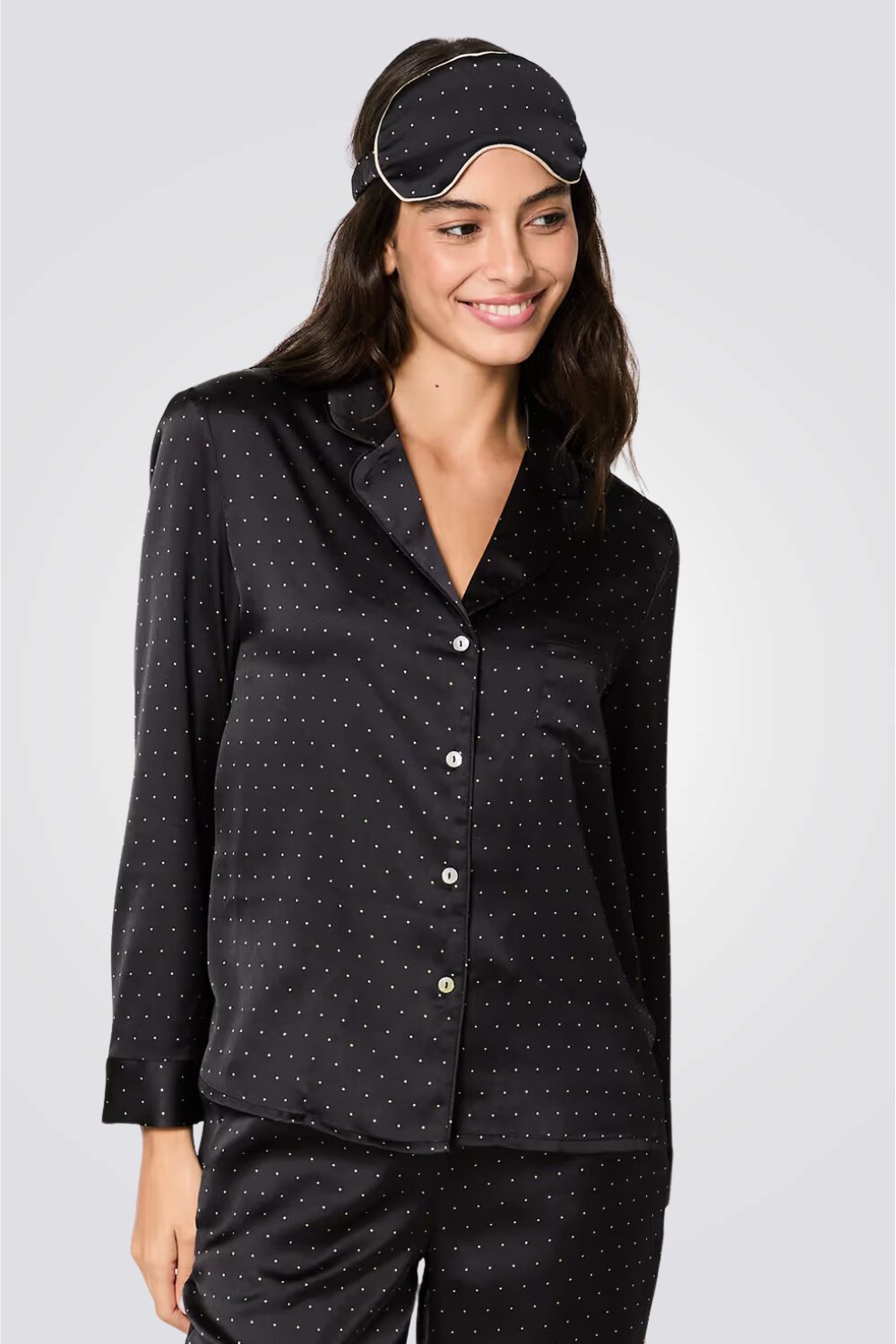 סט המגיע בתוך פאוץ' המכיל חולצת פיג'מה מכופתרת בעלת שרוולים ארוכים, מכנסיים בגזרה מתרחבת עם גומי במותן ומסכת שינה תואמת.