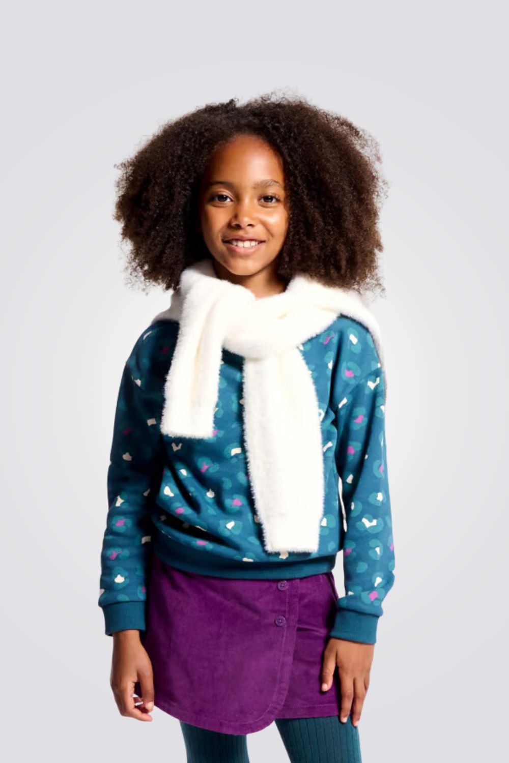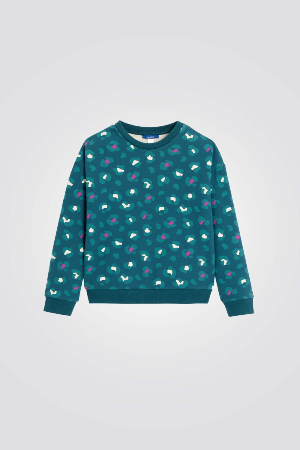 סווטשירט לילדות מבית המותג OKAIDI, בצבע טורקיז עם הדפס מנומר, מחמם ונעים, עם צווארון עגול ושרוולים ארוכים.
