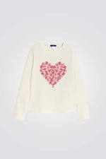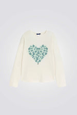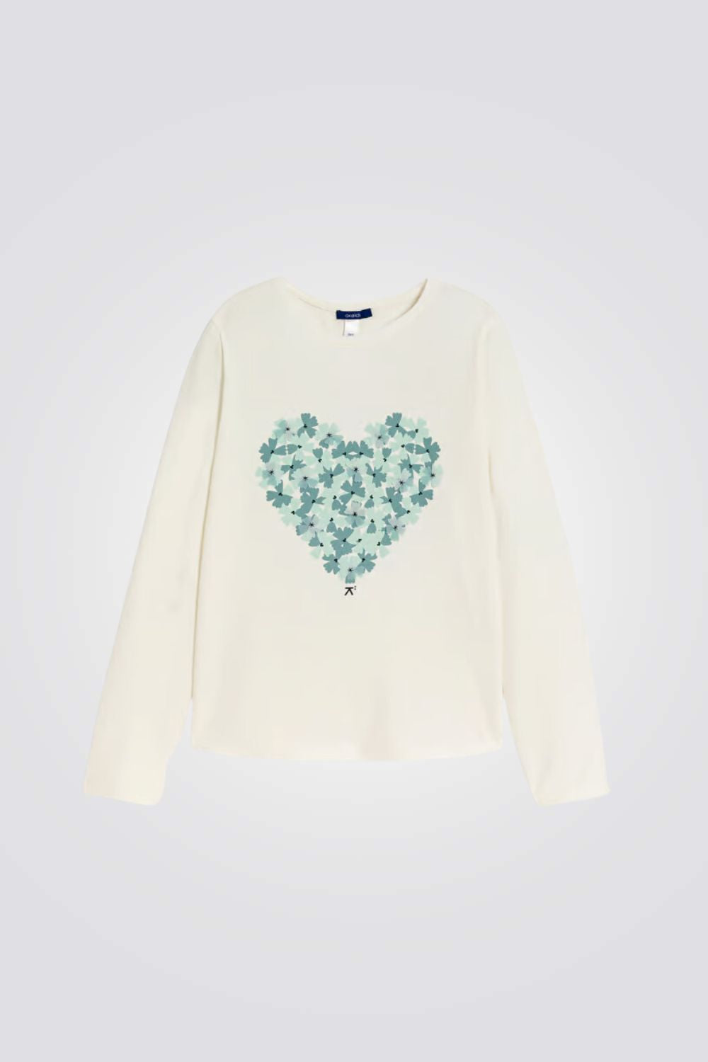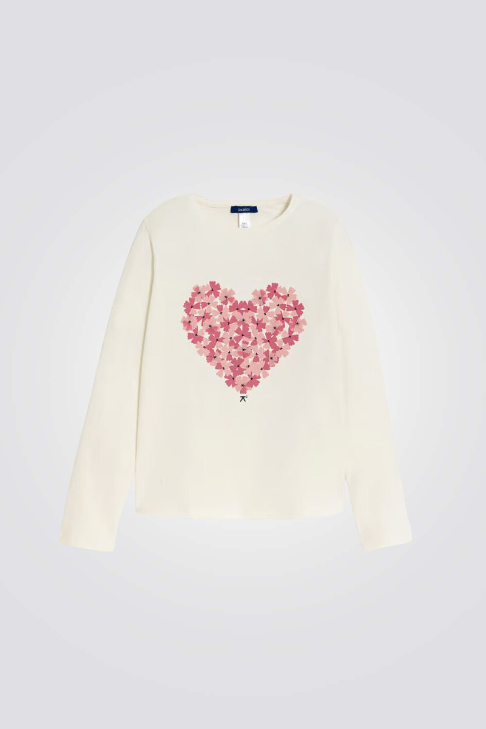 טישירט ללדות מבית המותג OKAIDI, בצבע לבן עם שרוולים ארוכים והדפס של לב, נעימה וקלילה עם צווארון עגול.