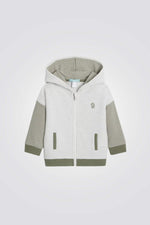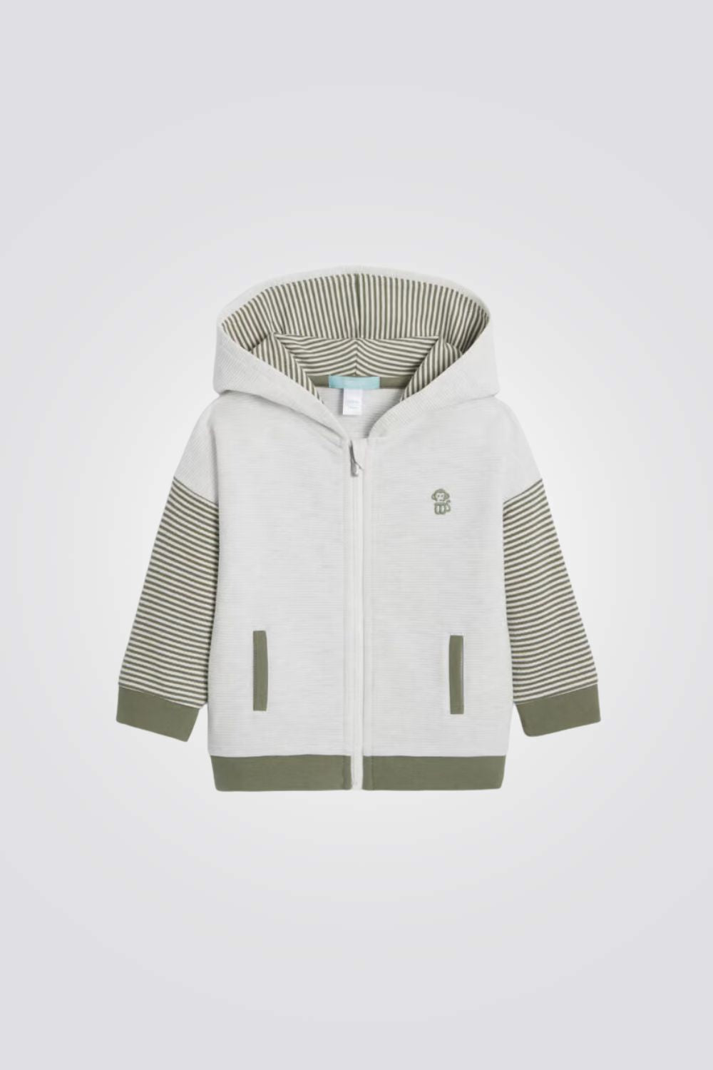 סווטשירט לתינוקות מבית המותג OBAIBI, בצבע אפור עם פסים בשרוולים ובקםוצ'ון, סגירת רוכסן, שני כיסים צדדיים והדפס קופיף מאחורה.