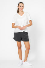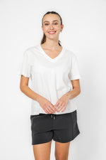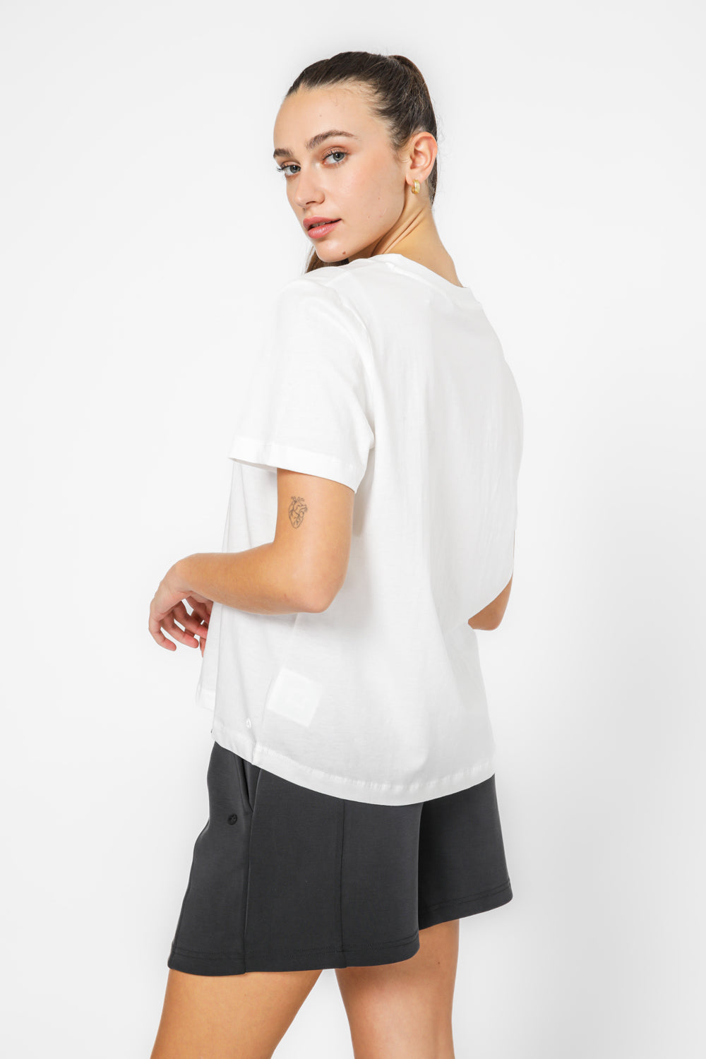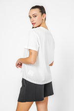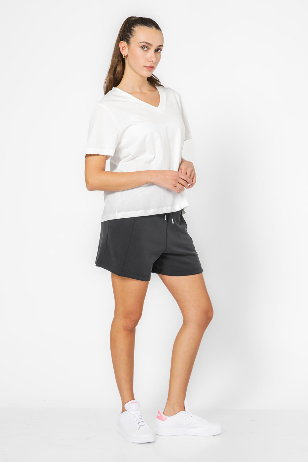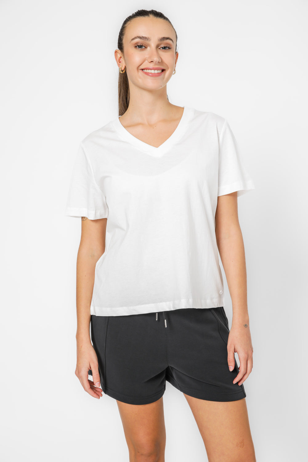 טישירט לנשים מבית המותג DELTA,בצבע לבן בגזרה משוחררת מבד סינגל ג’רסי קליל עם צווארון וי ושרוולים קצרים.