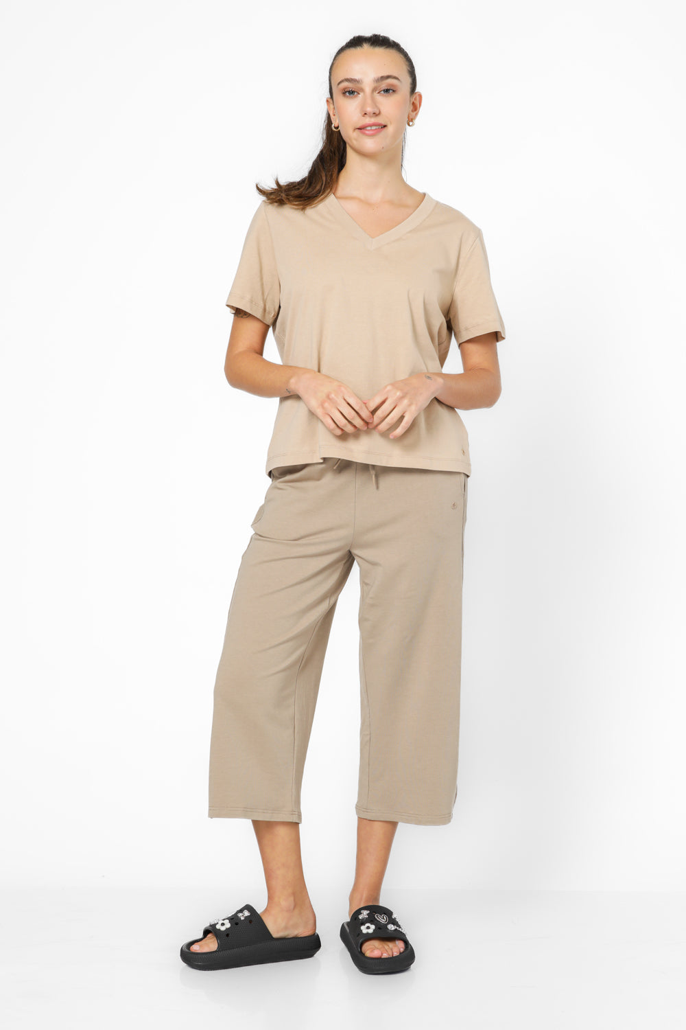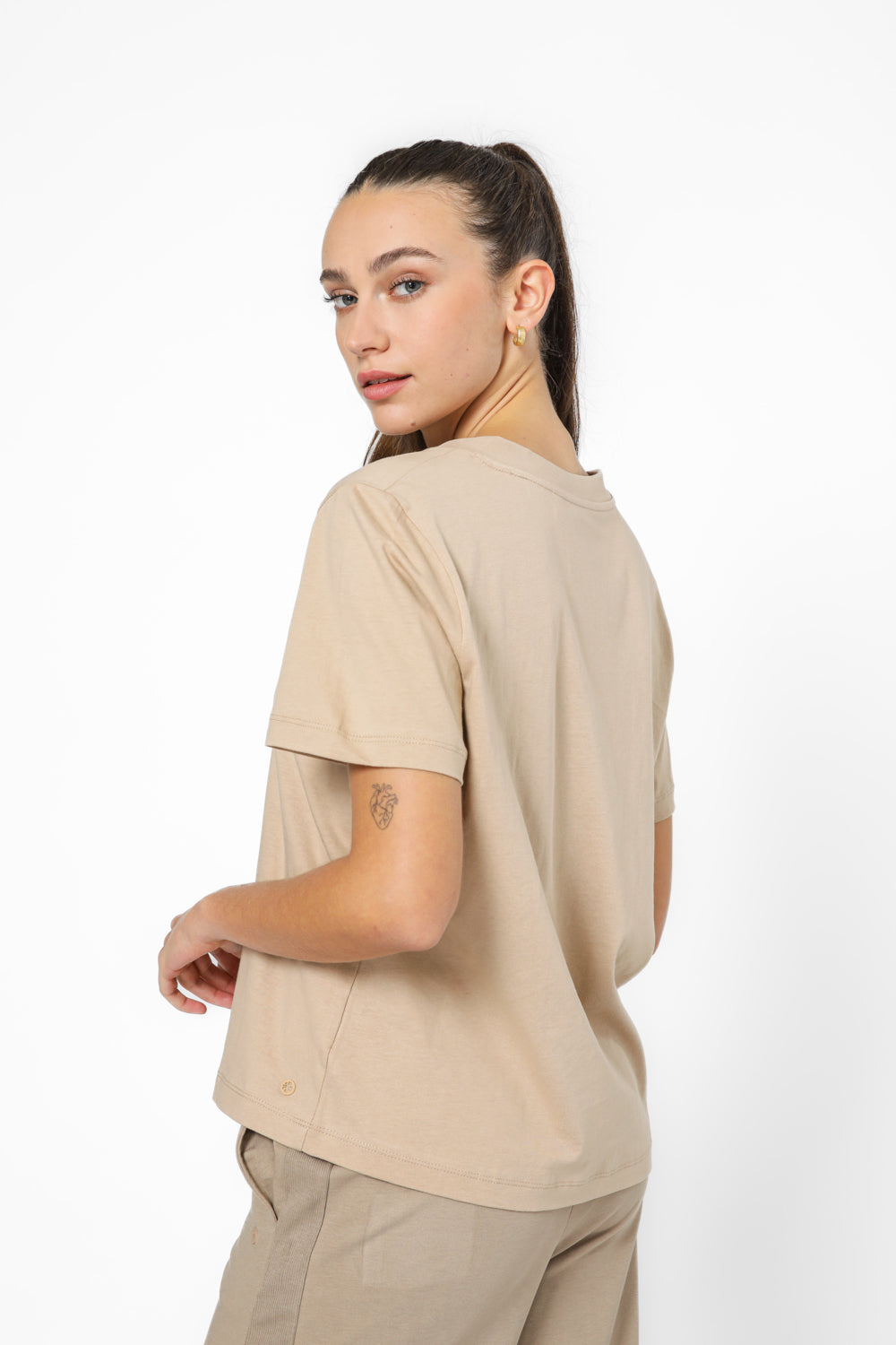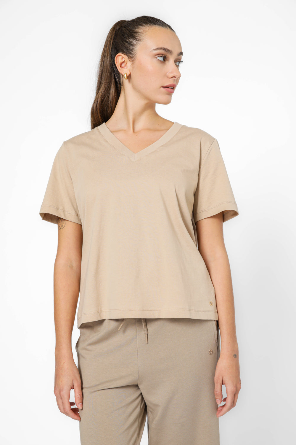 חולצה קצרה לנשים מבית המותג DELTA בגזרה משוחררת מבד סינגל ג’רסי קליל עם צווארון וי ושרוולים קצרים.