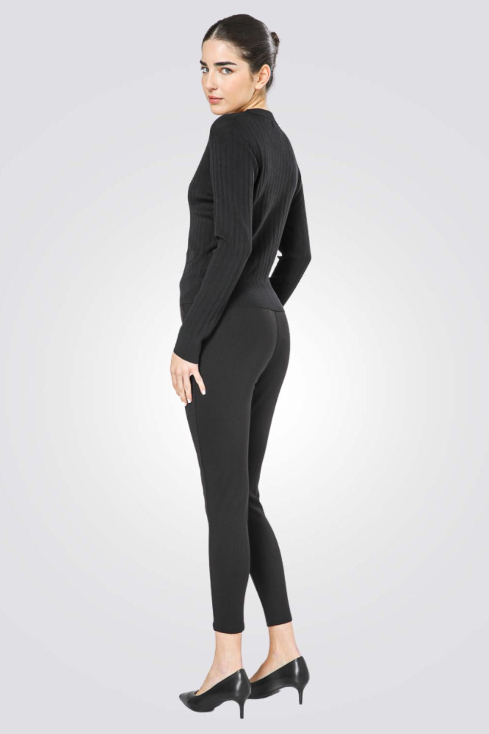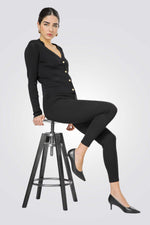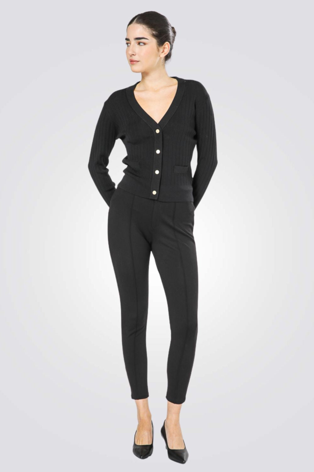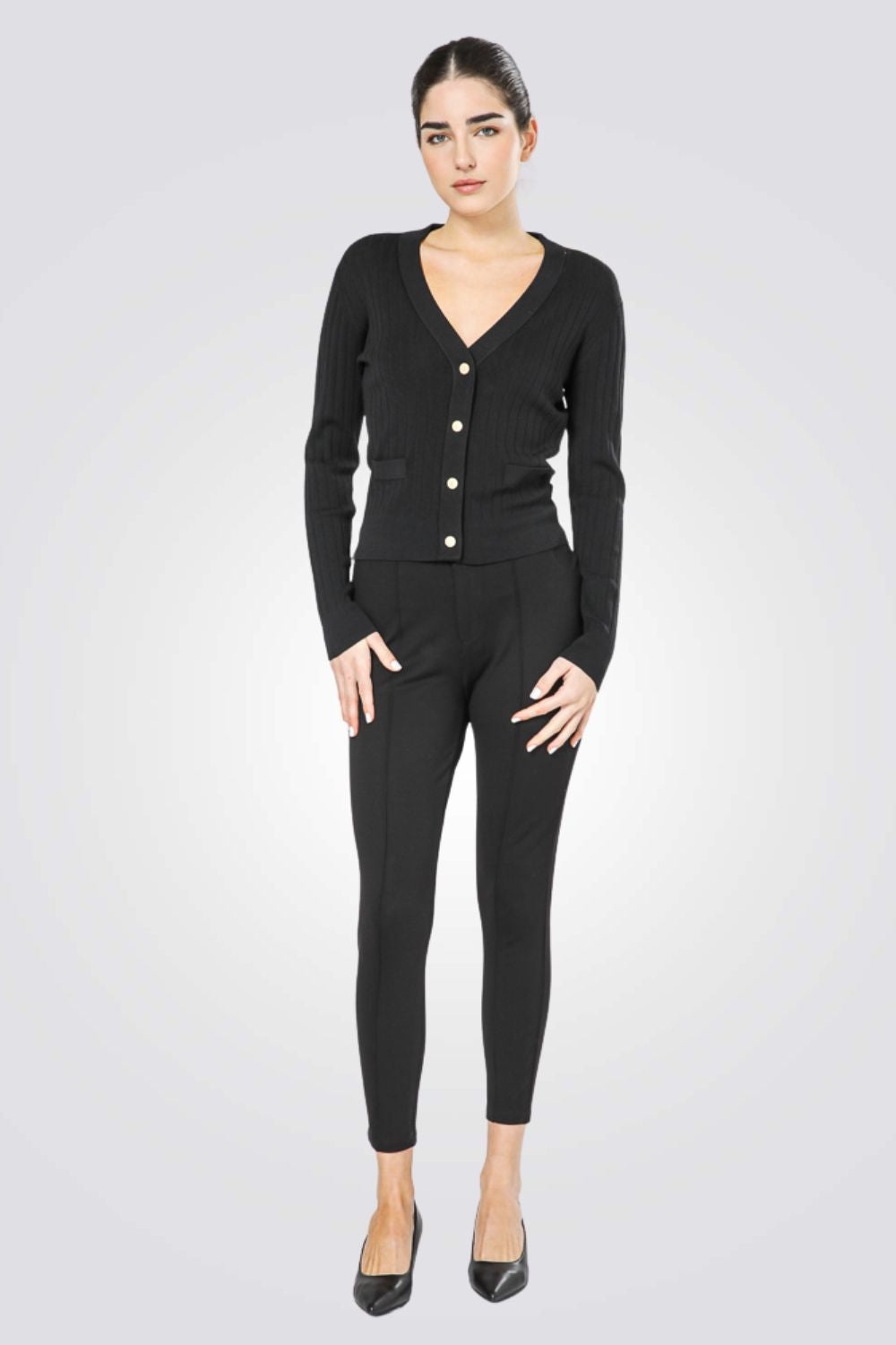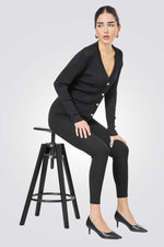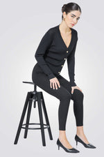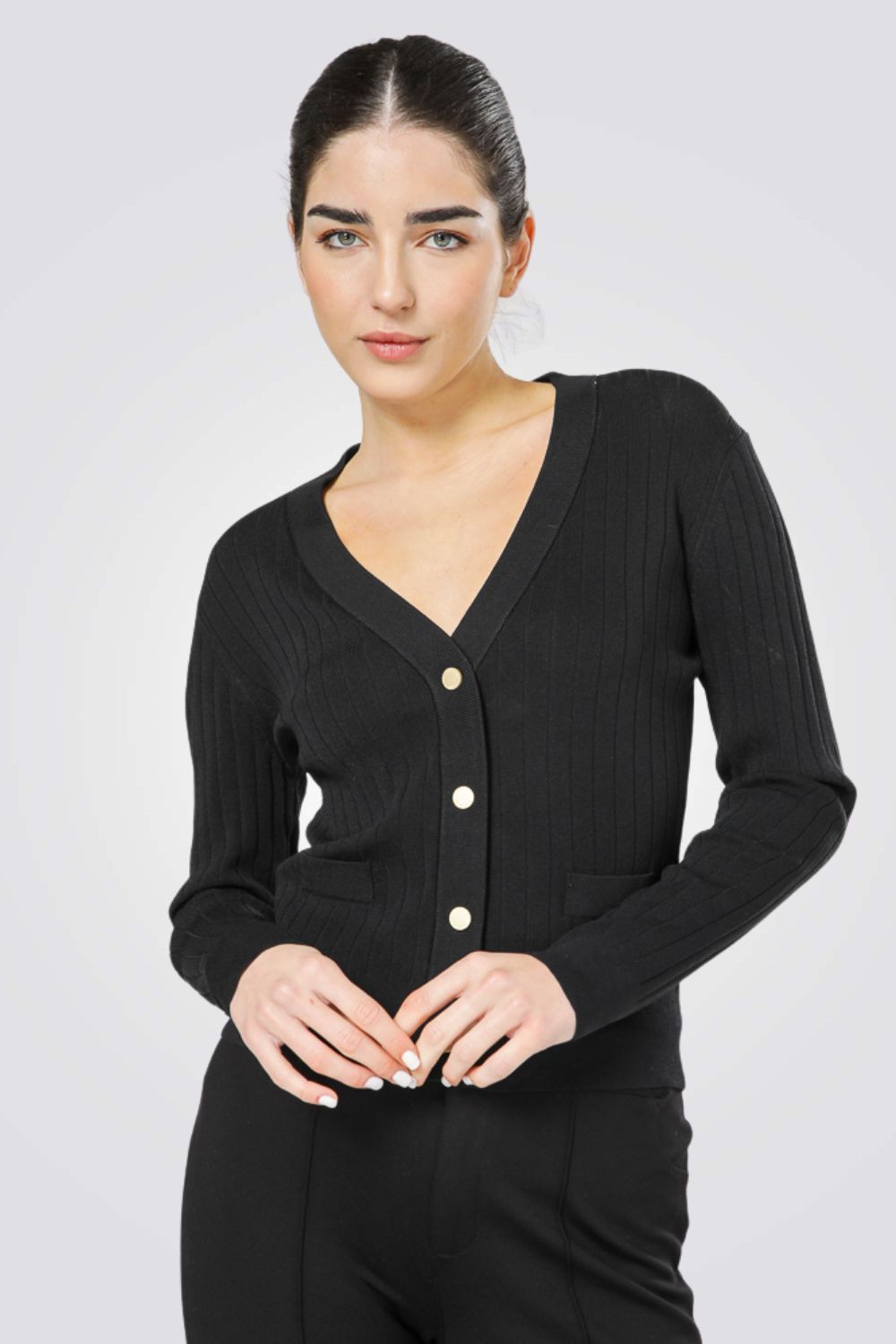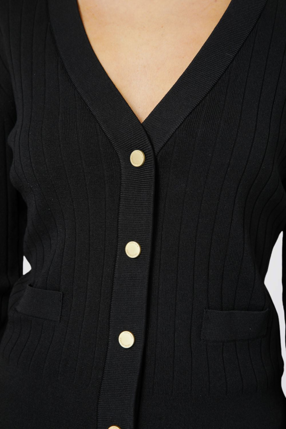 קרדיגן מבית המותג KENNETH COLE לנשים בצבע שחור, עשוי מבד סרוג דק רך ונעים למגע, בגזרה צמודה ונוחה, בעל שרוולים ארוכים, סגירת כפתורים מוזהבים מקדימה, מחשוף וי עמוק ומחמיא ושני כיסים דקורטיביים בצדדים.