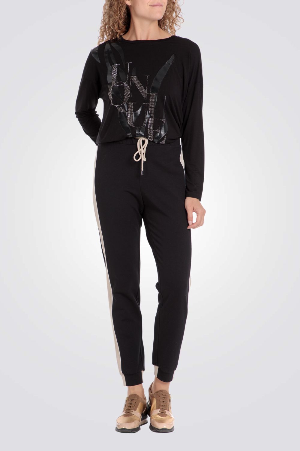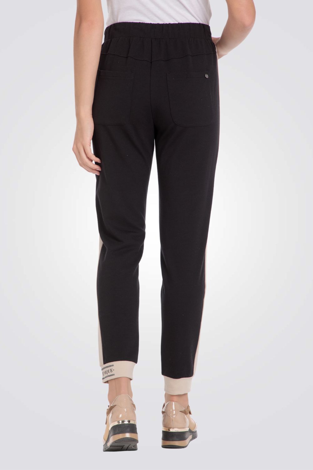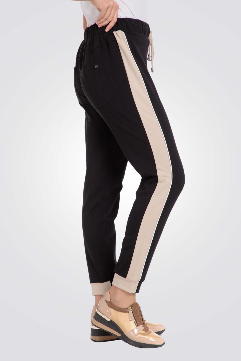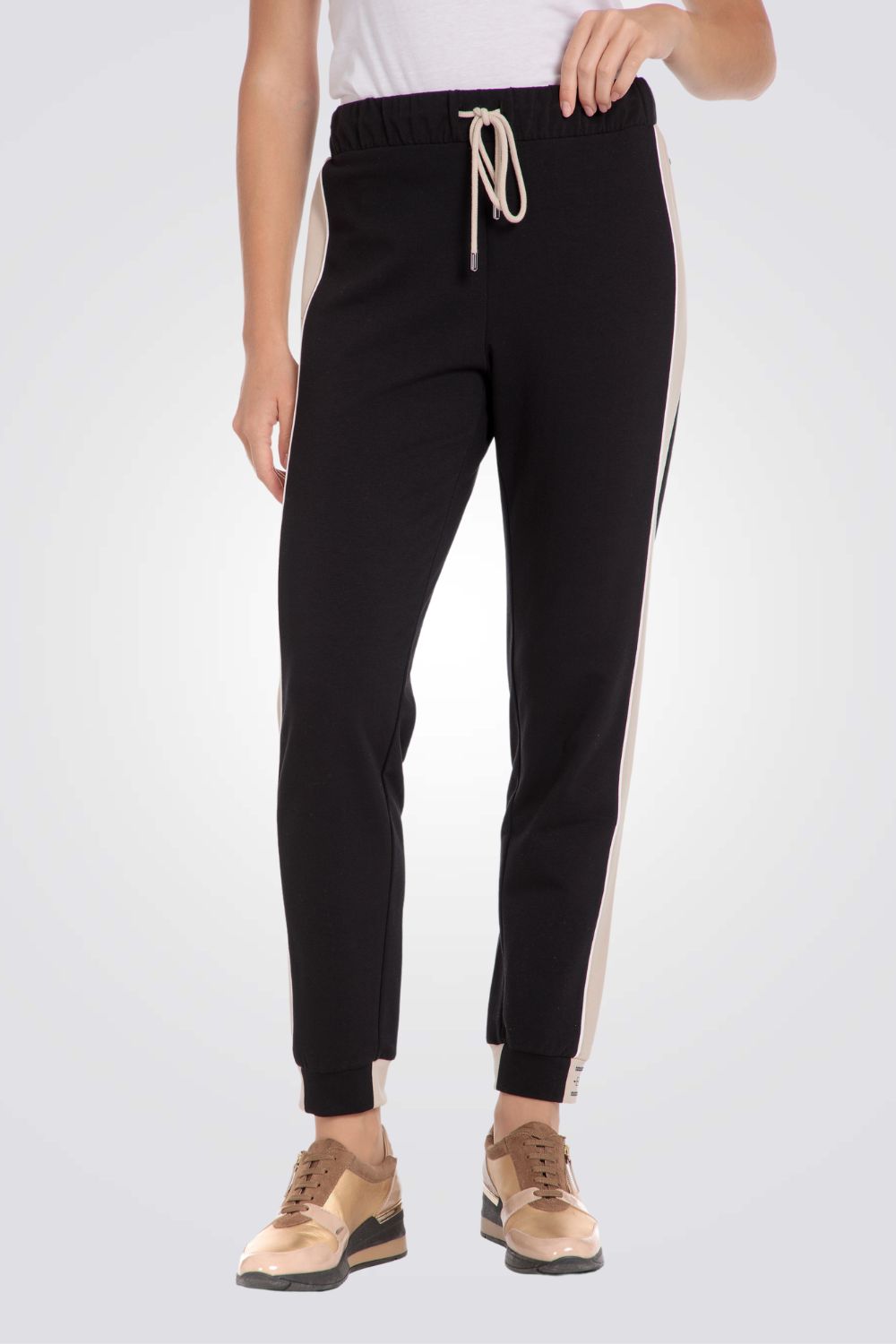 מכנסי טרנינג ארוכים מבית המותג PUNT ROMA בצבע שחור עם פסים צדדיים בצבע בז' ושני כיסים אחוריים.