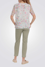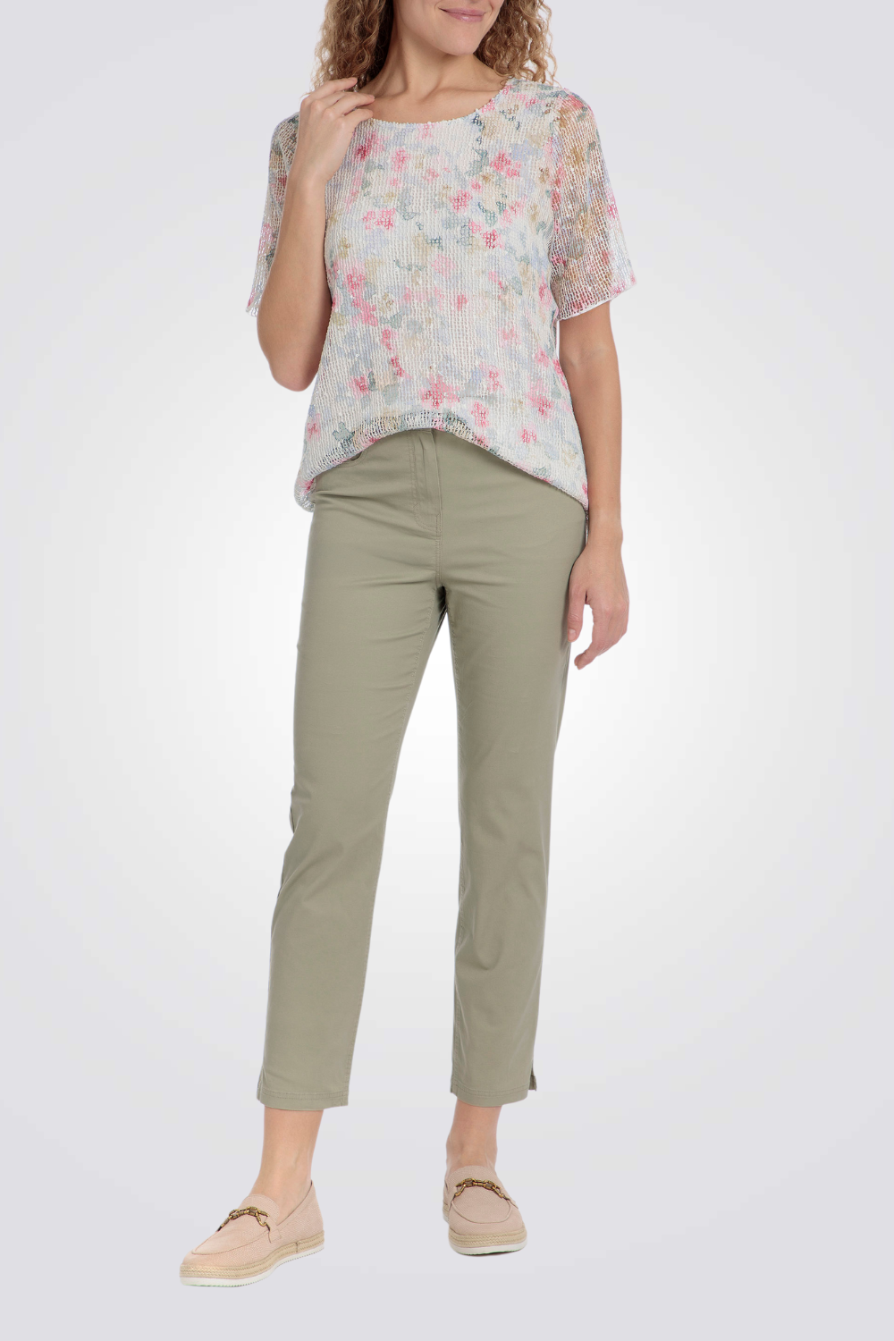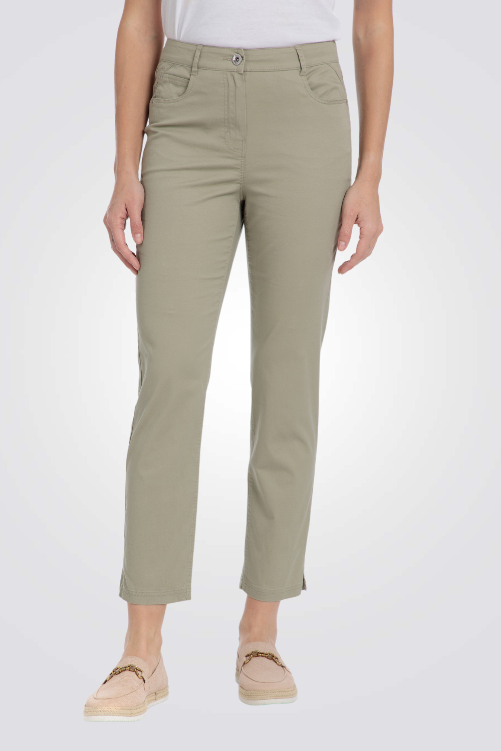 מכנסיי כותנה ארוכים לנשים מבית המותג PUNT ROMA בצבע ירוק חאקי, עם 5 כיסים, שסעים למטה, סגירת רוכסן וכפתור.