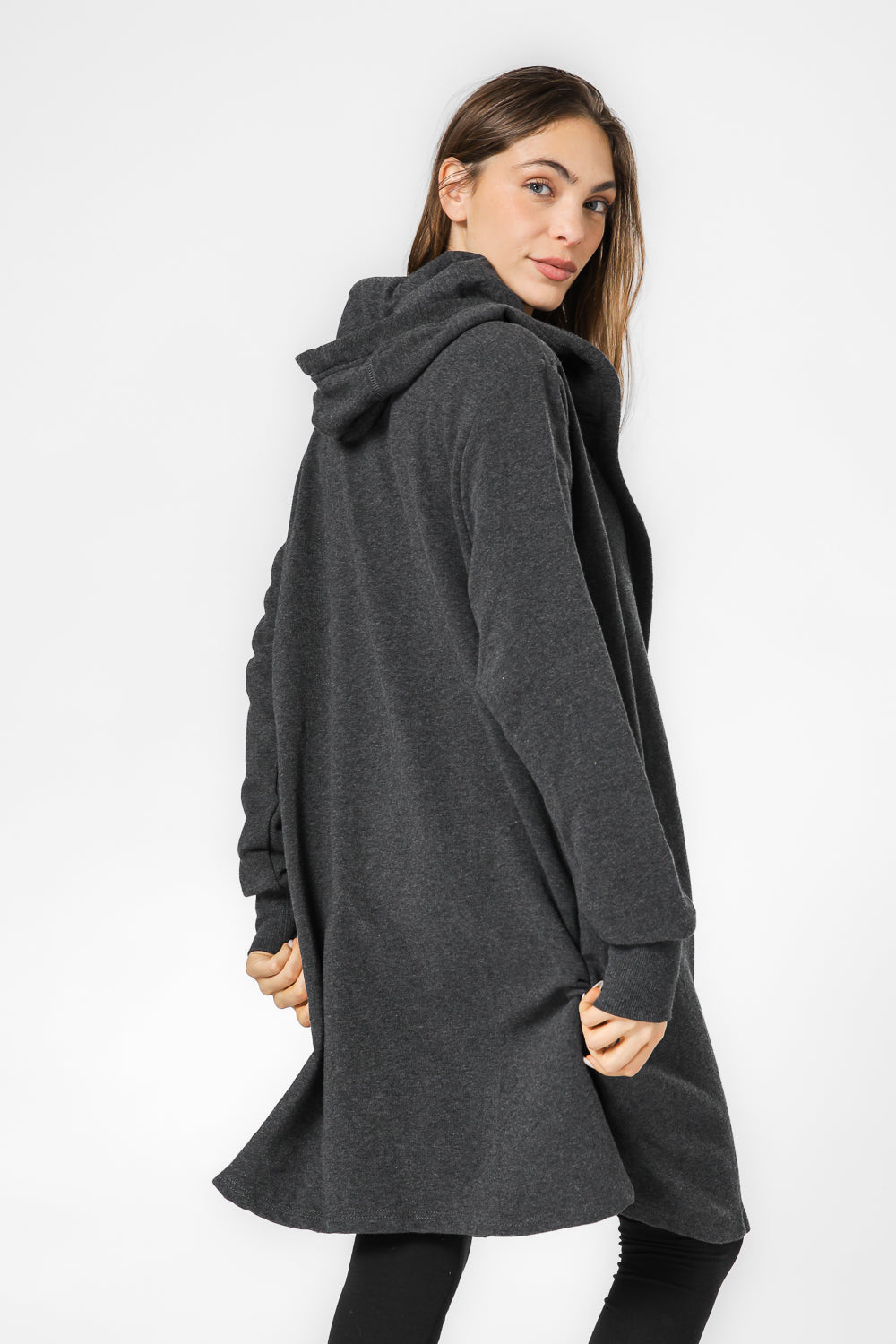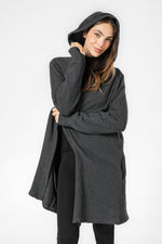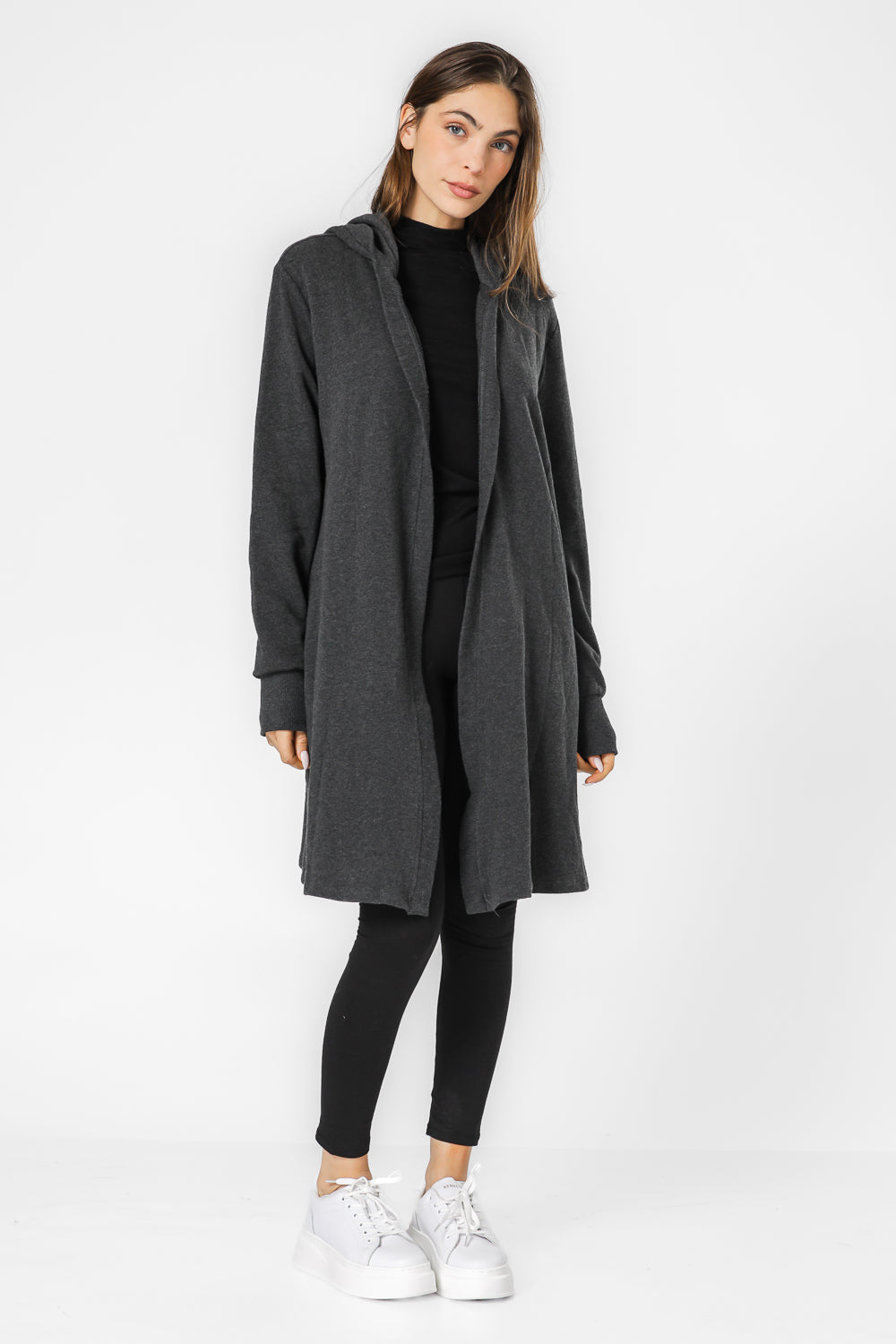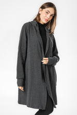 קרדיגן ארוך לנשים מבית המותג DELTA בגזרת לונגליין העשוי מבד פרנץ’ טרי נעים ורך עם קפוצ’ון.