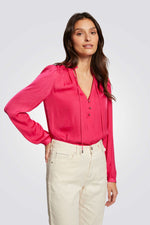 צווארון V, שרוולים נפוחים, כפתורים דקורטיביים בקו הצוואר.