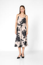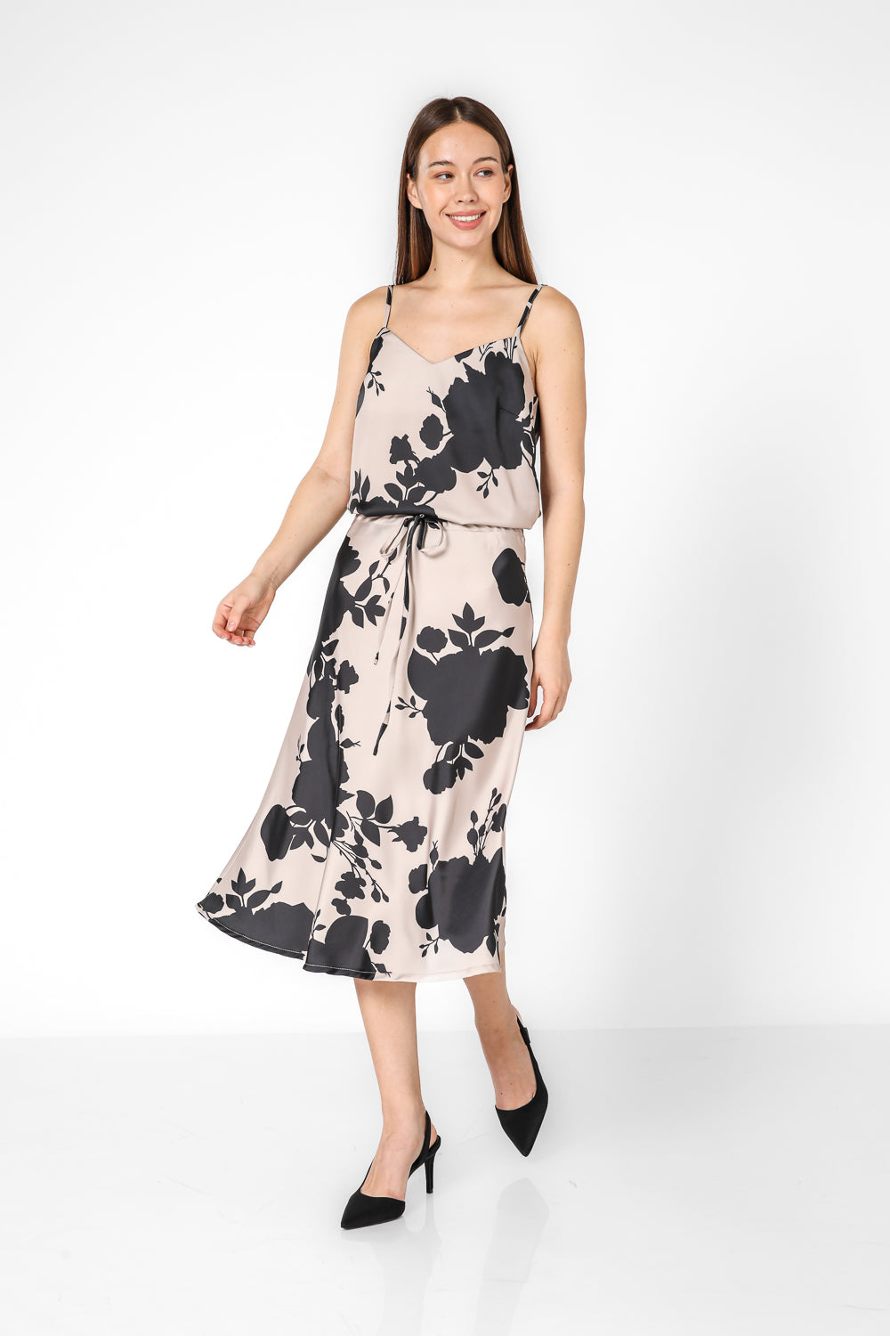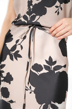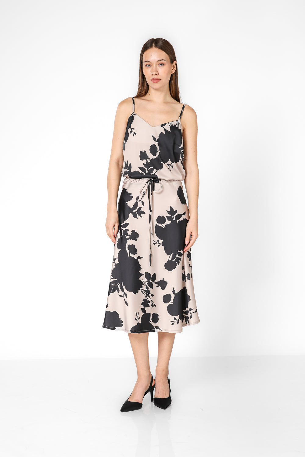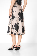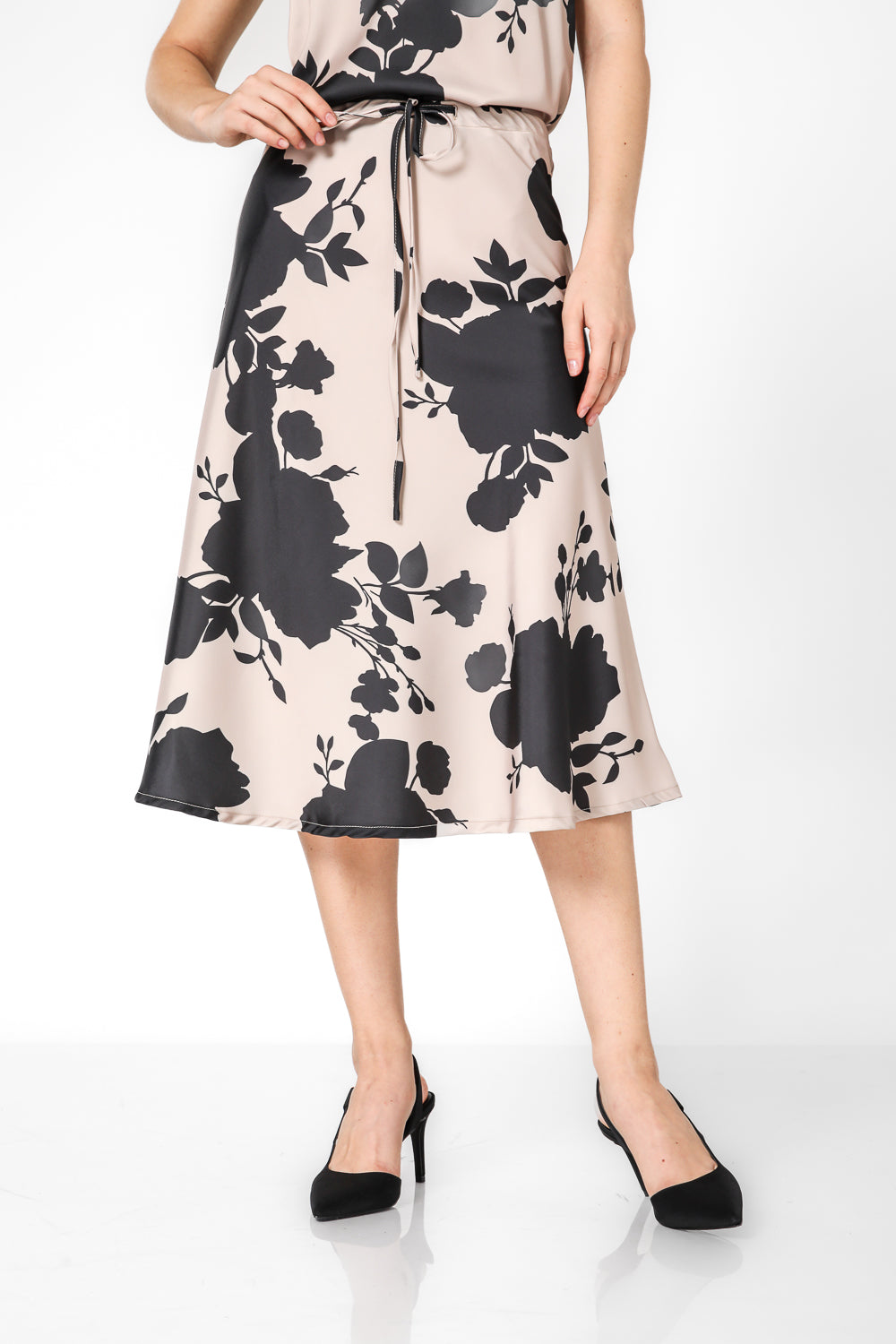 חצאית מידי סאטן בהדפס פרחים בצבע בז'