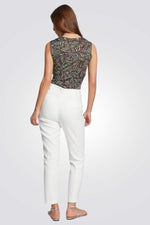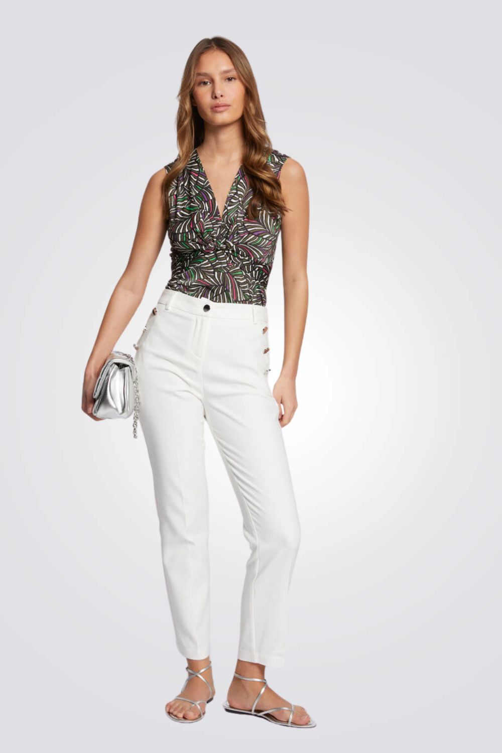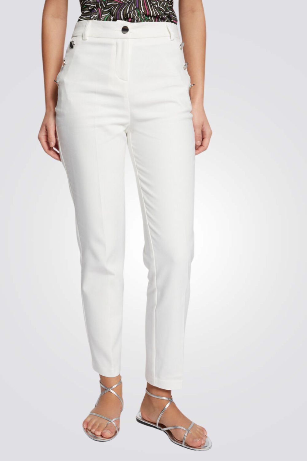 מכנסי 3/4 בצבע לבן לנשים מבית המותג MORGAN בגזרה גבוה ומחמיאה, בעלי רוכסן וכפתור סגירה בחזית, כפתורים דקורטיביים בצידי הרגליים ולולאות ייעודיות לחגורה בקו מותניים.