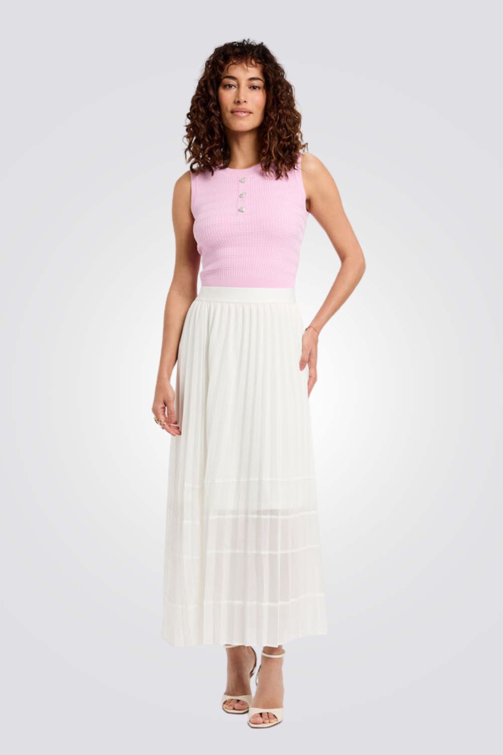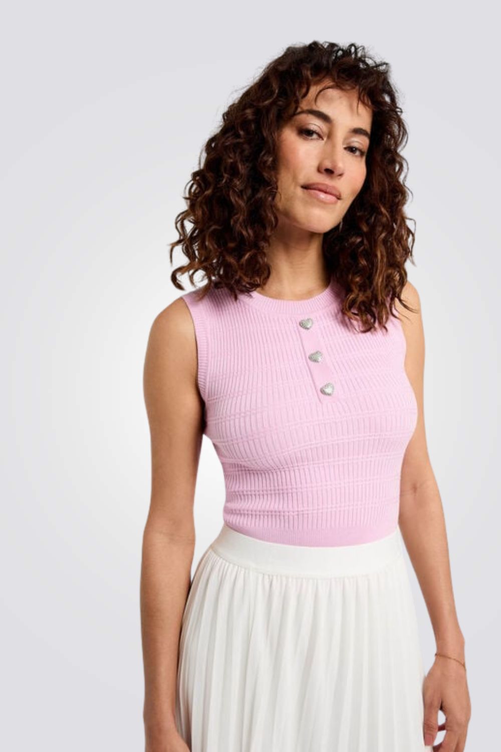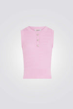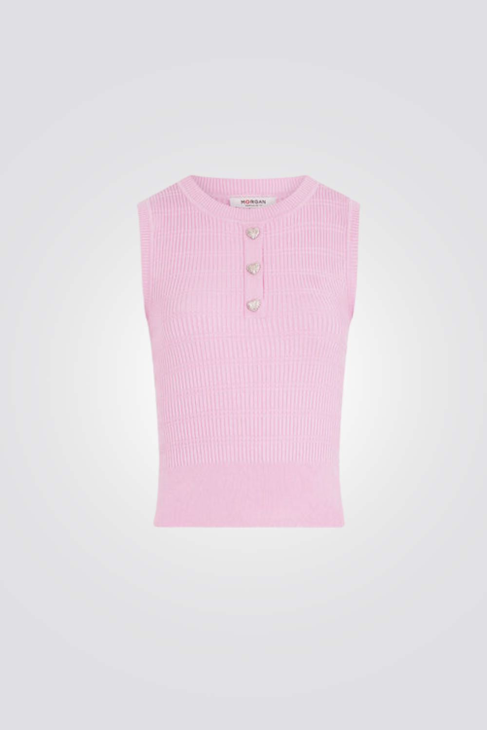 גופיה לנשים מבית המותג MORGAN,בצבע ורוד, עשוי מבד סריג נעים ועדין, בגזרה צמודה ומחמיאה, עם כפתורים דקורטיביים בצווארון .