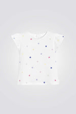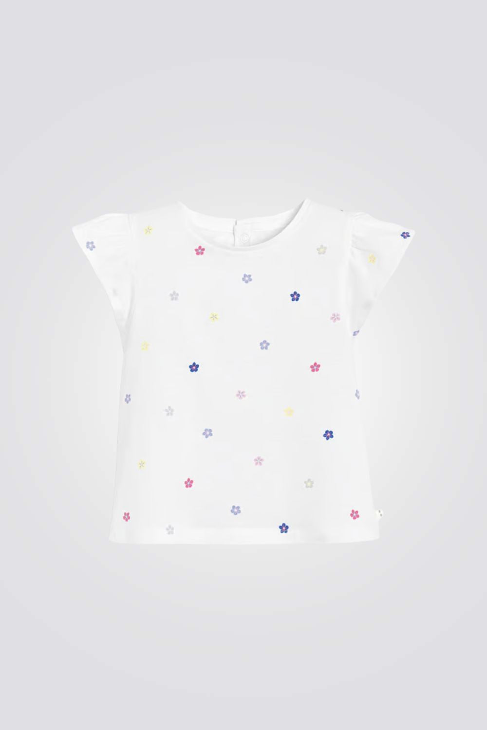 טישירט לתינוקות מבית המותג OBAIBI, בצבע לבן עם הדפס פרחים, עם שרוולי מלמלה קצרים וצווארון עגול.