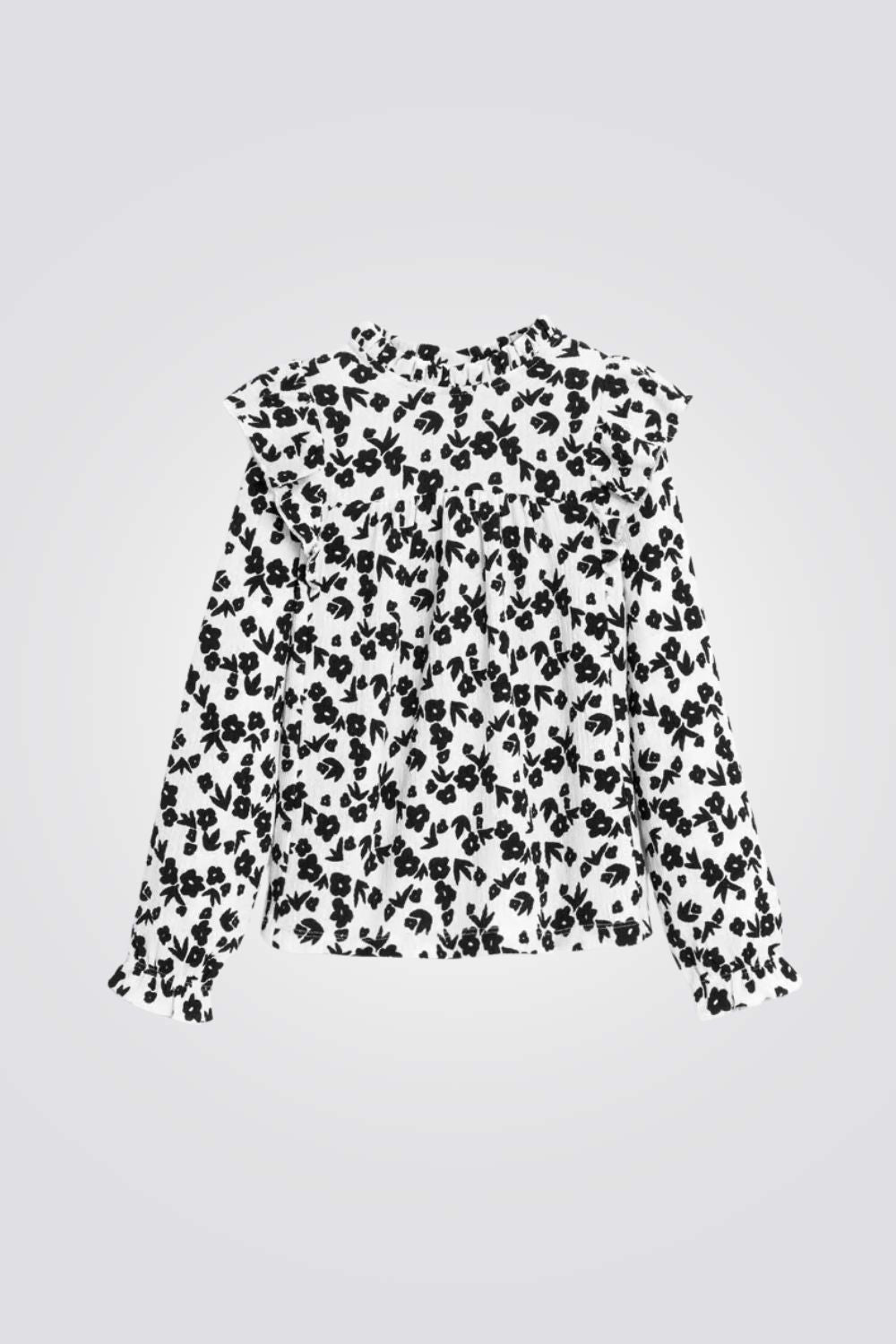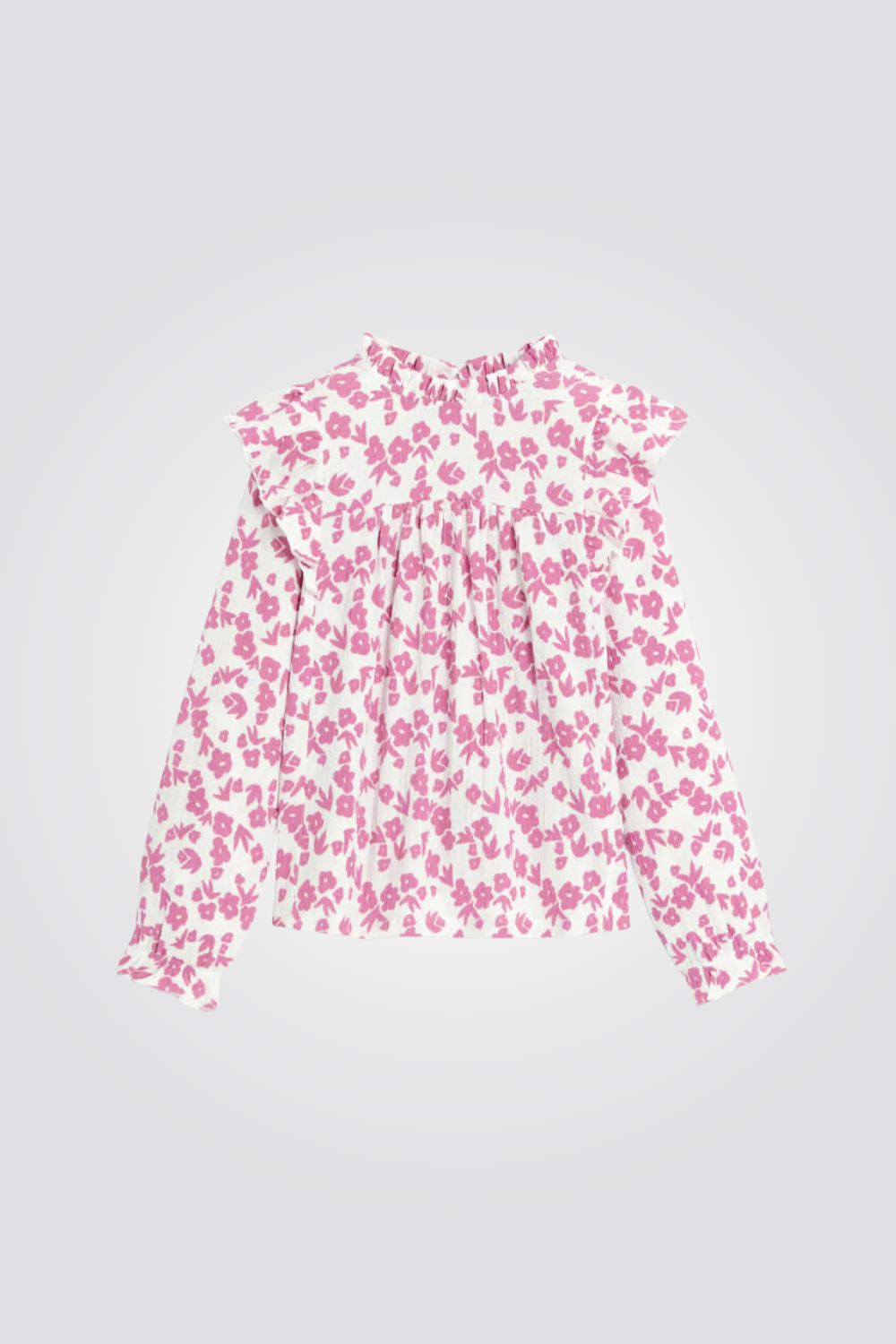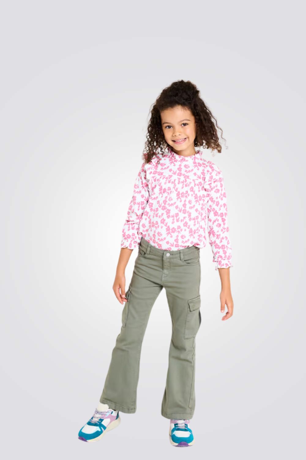 חולצה ארוכה לילדות מבית המותג OKAIDI, עם הדפס מנומר, צווארון עגול וגבוהה עם מלמלה , ושרוולים ארוכים עם סיומת גומי.