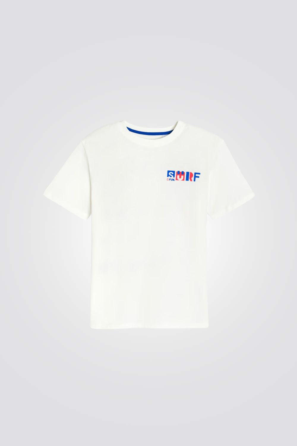 טישירט לילדים מבית המותג OKAIDI, בצבע לבן עם הדפס ,עשויה מבד ג'רסי רך ,בגזרה ישרה עם שרוולים קצרים וצווארון עגול.