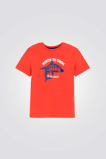 טישירט לילדים מבית המותג OKAIDI, בצבע כתום עם הדפס כריש בגזרה ישרה עם צווארון עגול ושרוולים קצרים.