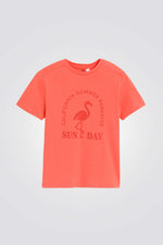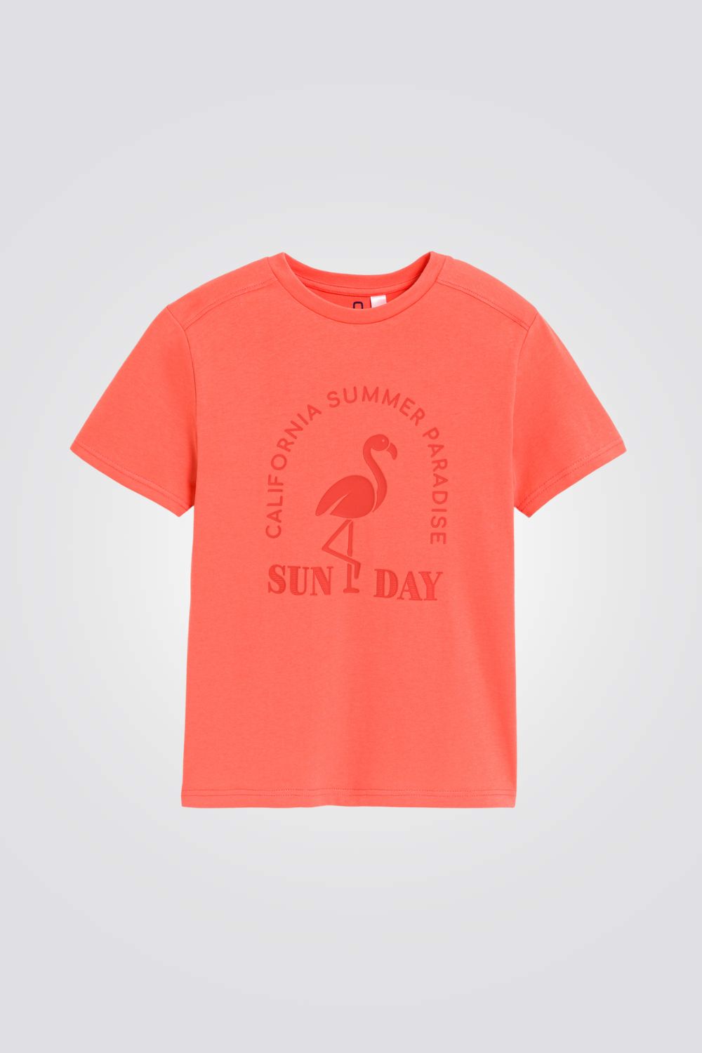 טישירט לילדים מבית המותג OKAIDI, בצבע כתום עם הדפס , בגזרה ישרה מבד ג'רסי רך , צווארון עגול ושרוולים קצרים.