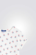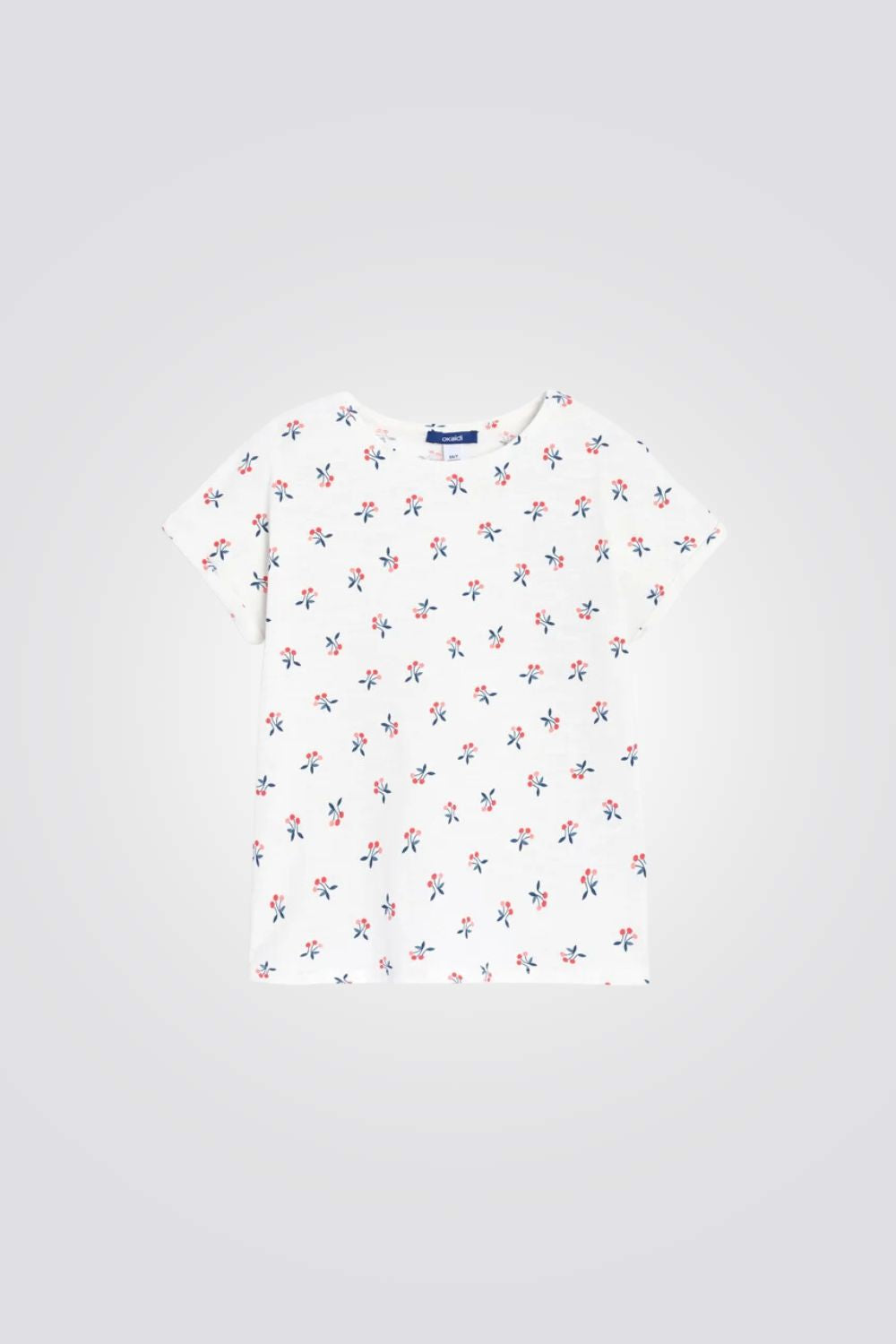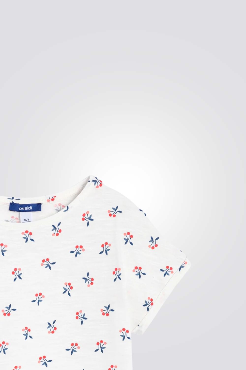 טישירט לילדות מבית המותג OKAIDI, בצבע לבן עם הדפס דובדבנים , בגזרה ישרה עם שרוולים קצרים וצווארון עגול.