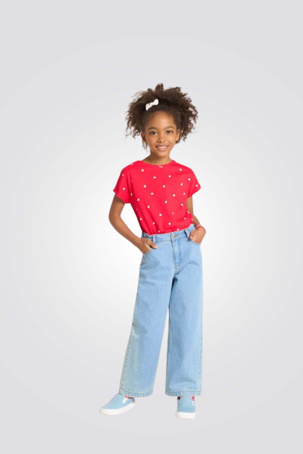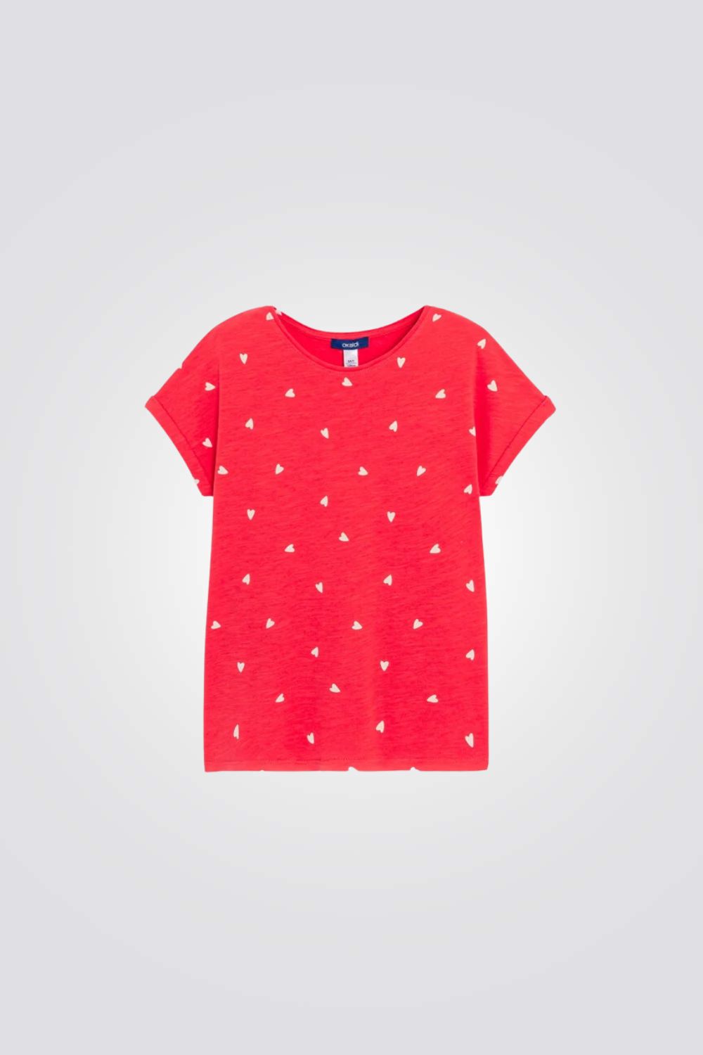 טישירט לילדות בצבע אדום עם הדפס לבבות בלבן