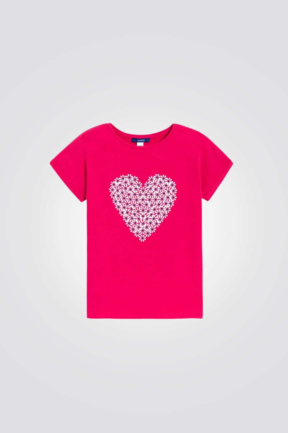 טישירט לילדות מבית המותג OKAIDI, בצבע ורוד פוקסיה עם הדפס לב פרחוני , עם שרוולים קצרים וצווארון עגול בגזרה ישרה .