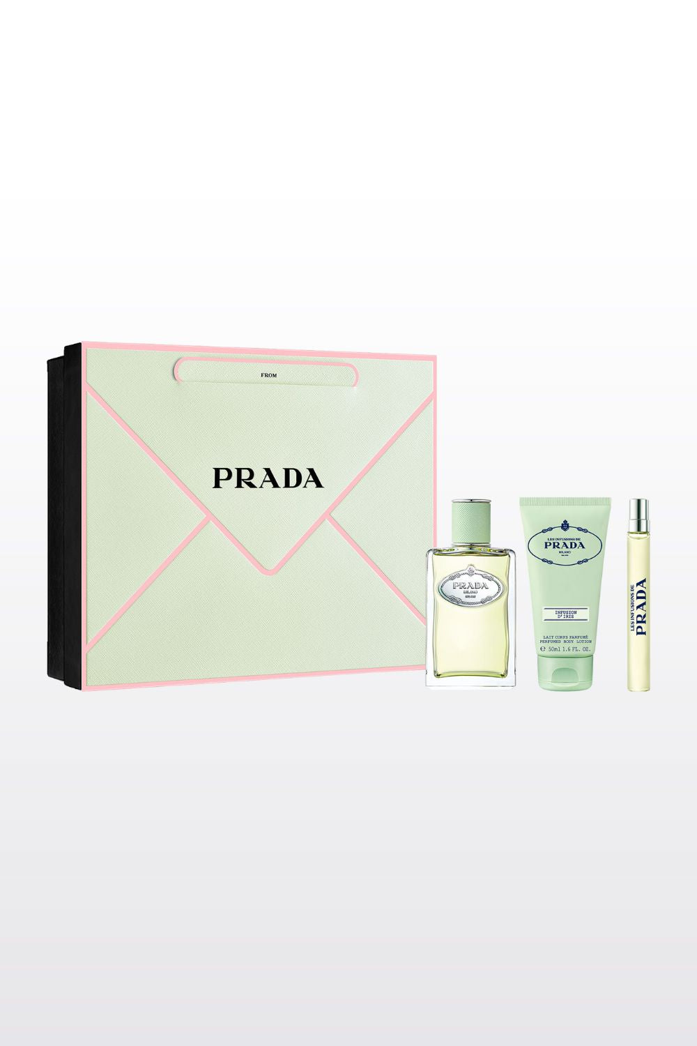 INFUSION d’IRIS EDP SET הוא מארז המוצג באריזת מתנה האייקונית של פראדה, וכולל שלושה מוצרים: בושם Infusion d’Iris בנפח 100 מ”ל, טראבל סייז בושם infusion d’iris בנפח 10 מ״ל וקרם גוף תואם בנפח 50 מ״ל. הבושם, טהור ואלגנטי, הוא הריח החתום של הקולקציה Les Infusions de Prada. הוא חושף חוויית ריח מושלמת, המשולבת תווי נרולי, מנדרינה ובנזואין. בעל אופי פרחוני ועצי, הבושם ממוסגר בבקבוק בעיצוב מורשת פראדה המתוחכם. המכסה בצבע ירוק מעור Saffiano הוא מחווה לצבע הירוק האייקוני של פראדה.