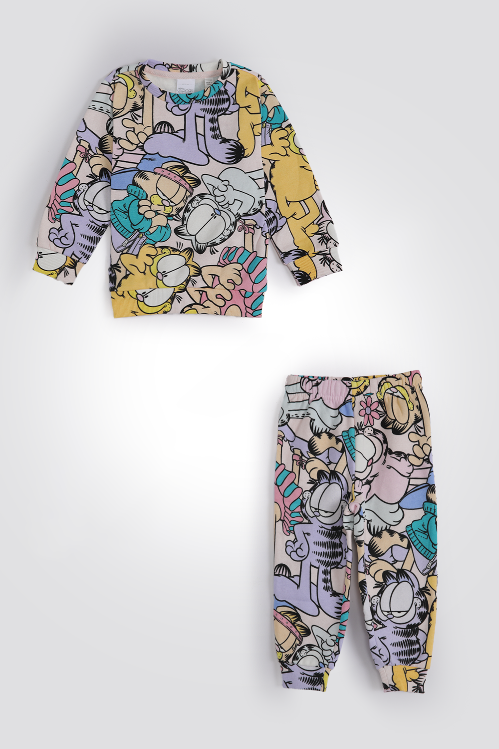 סט פיג'מה לילדות מבית המותג DELTA העשוי מבד פוטר רך ומחמם עם הדפס צבעוני של גארפילד. חולצה עם צווארון עגול ושרוולים ארוכים עם סיומת מנג’ט ומכנסיים ארוכים עם גומי במותניים וסיומת מנג’ט.
