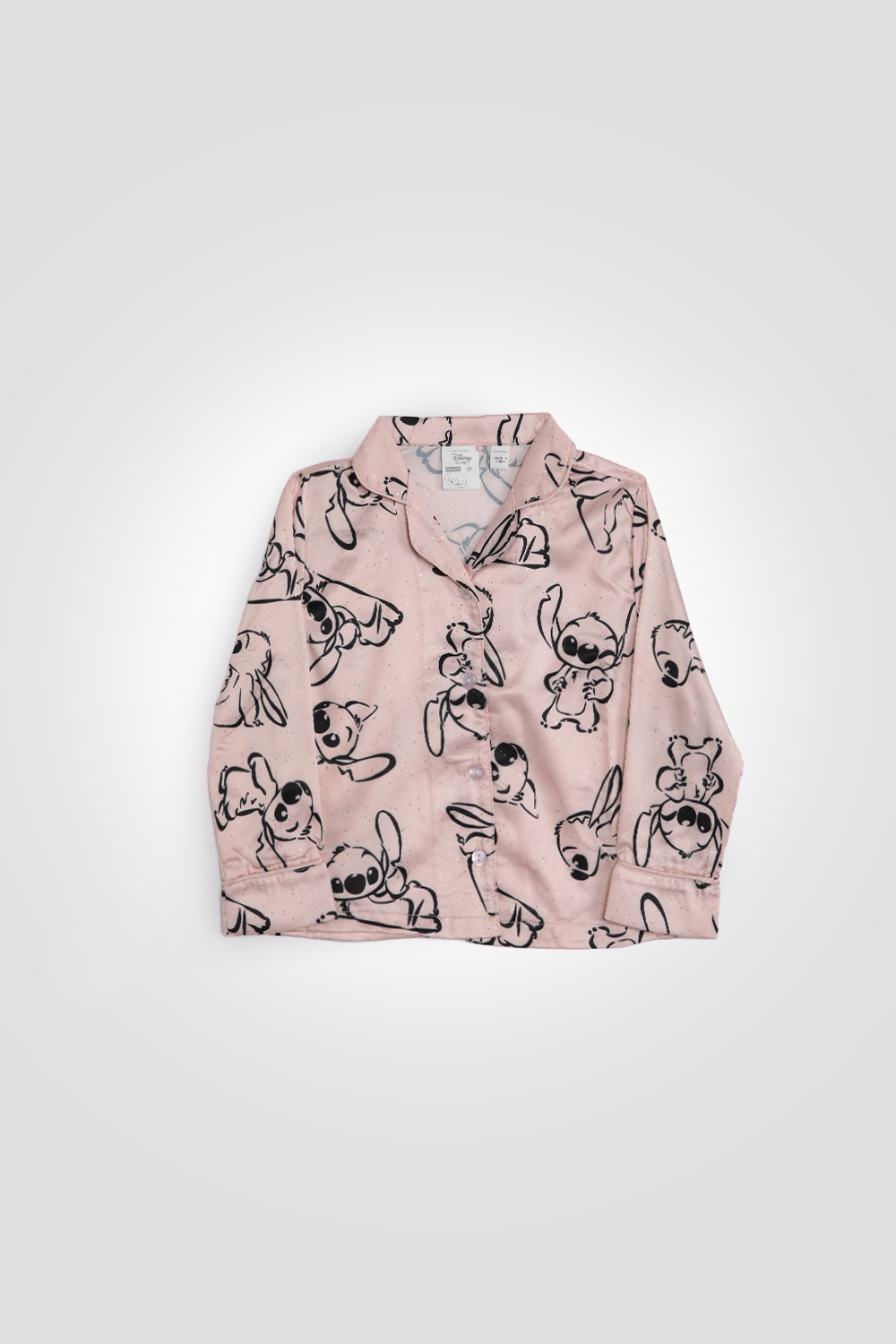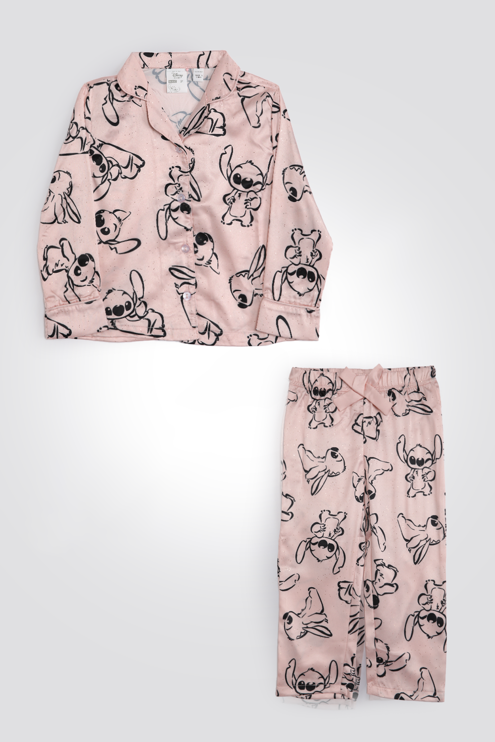סט פיג’מה לילדות מבית המותג DELTA העשויה מבד סאטן מנצנץ עם הדפסים של סטיץ. חולצה מכופתרת עם צווארון משולשים, שרוולים ארוכים ומכנסיים ארוכים תואמים בגזרה ישרה עם שרוכי קשירה.