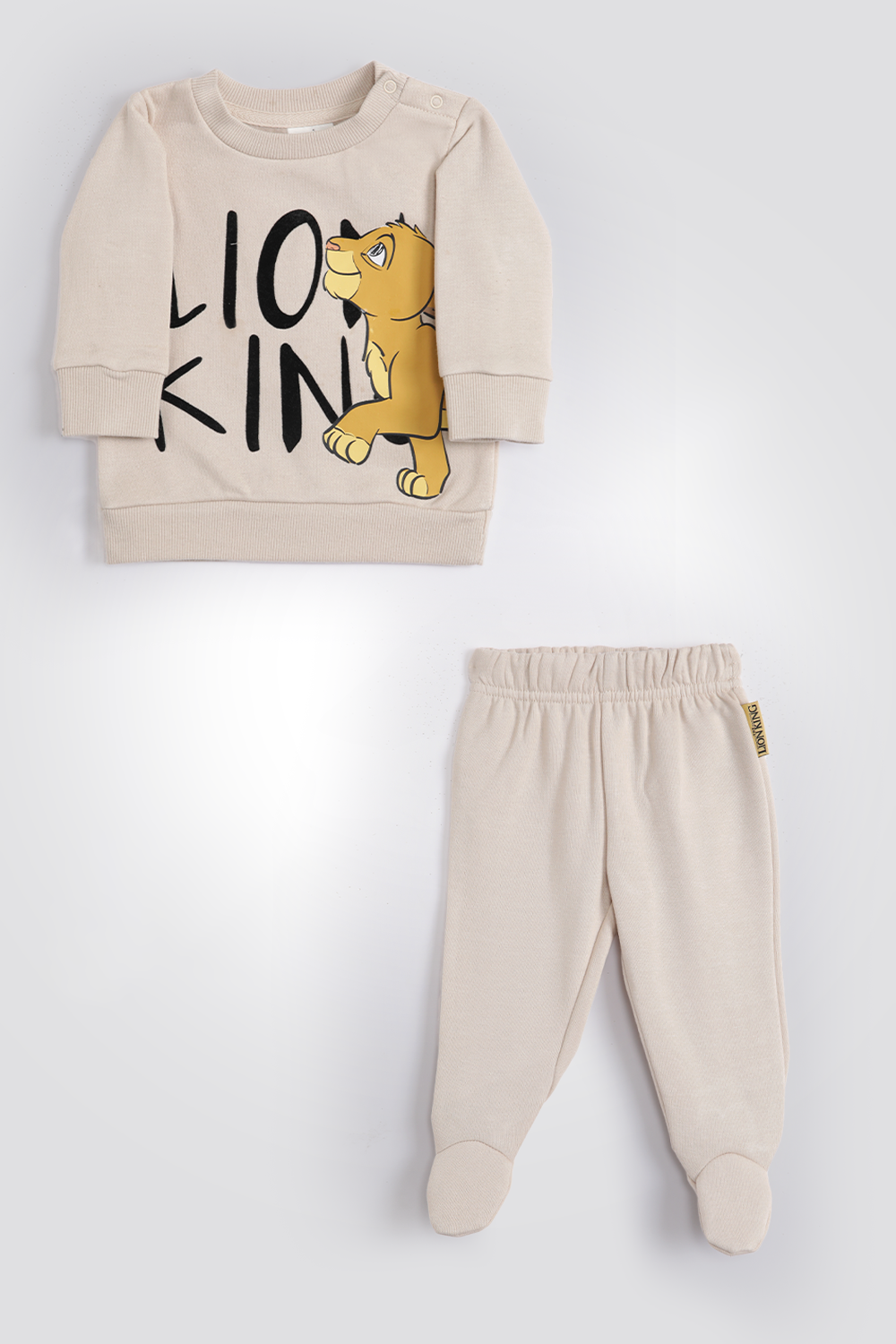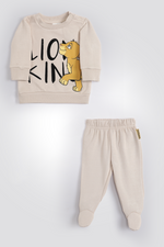סט פיג’מה לתינוקות מבית המותג DELTA מבד פוטר רך ומחמם עם הדפס של מלך האריות. חולצה עם צווארון עגול וסוגרי תיק-תק, שרוולים ארוכים וסיומת מנג’ט ומכנסיים ארוכים עם גומי במותניים וסיומת מנג’ט. בטווח המידות 0/3-6.12 למכנסיים יש רגליות.