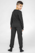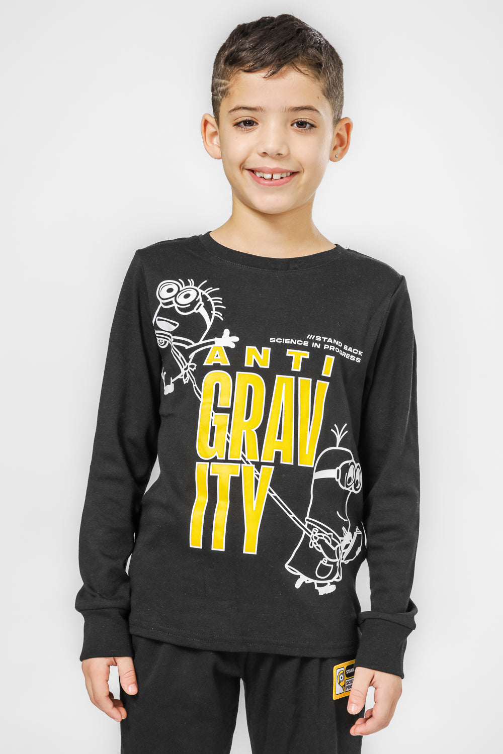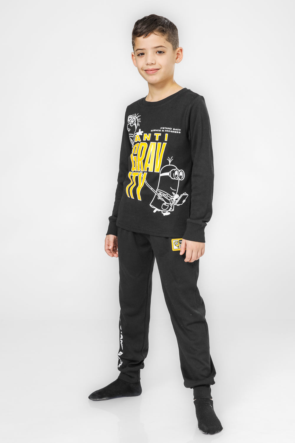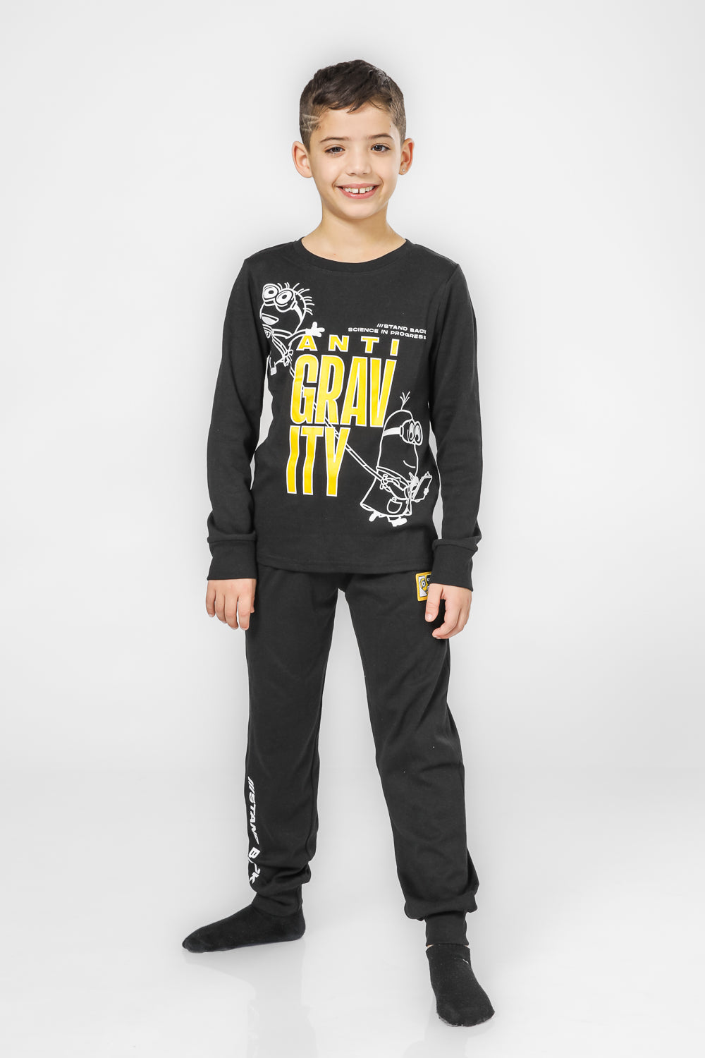 סט ארוך מבד אינטרלוק רך ונעים עם הדפס של המיניונים. חולצה עם צווארון עגול, שרוולים ארוכים בסיומת מנג’ט ומכנסיים ארוכים תואמים עם גומי במותניים וסיומת מנג’ט