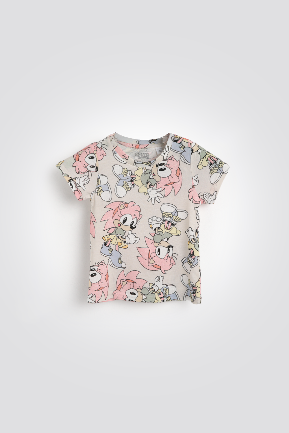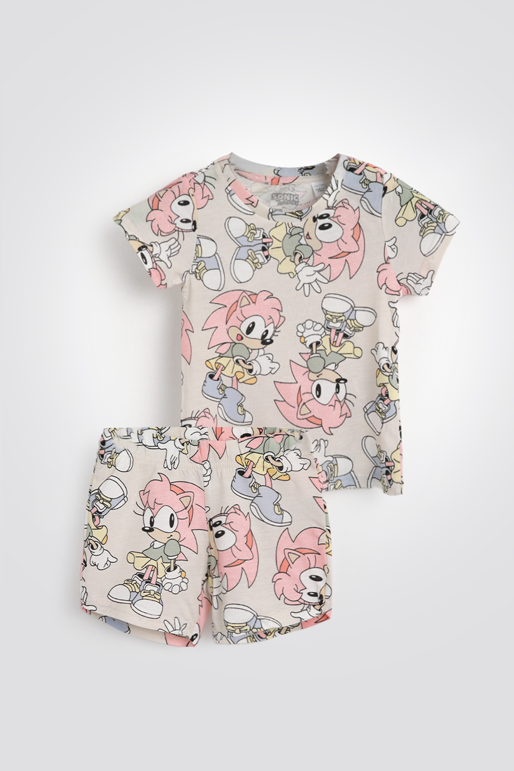 סט פיג'מה לילדות מביתה מותג DELTA העשויה מבד קליל עם הדפס מתוק של סוניק. חולצה עם צווארון עגול ושרוולים קצרים, ומכנסיים קצרים תואמים עם גומי במותניים.