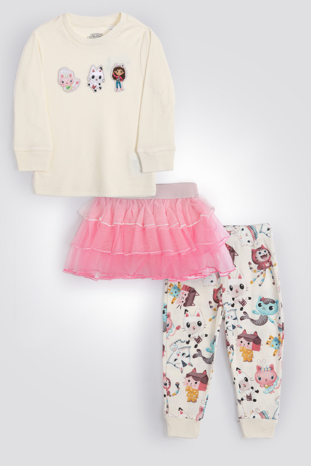 סט פיג’מה לילדות מבית המותג DELTA העשויה מבד אינטרלוק נעים במוטיב קסום של בית הבובות של גבי.