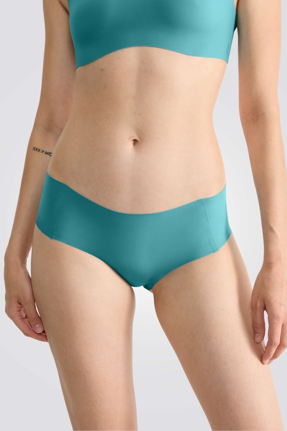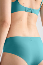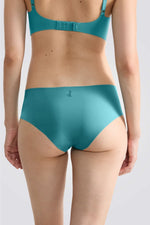 תחתוני היפסטר מבית המותג SLOGGI לנשים בצבע תכלת, ללא תפרים, קצוות בחיתוך חופשי ולוגו המותג מוטבע מאחור בצבע אפור.