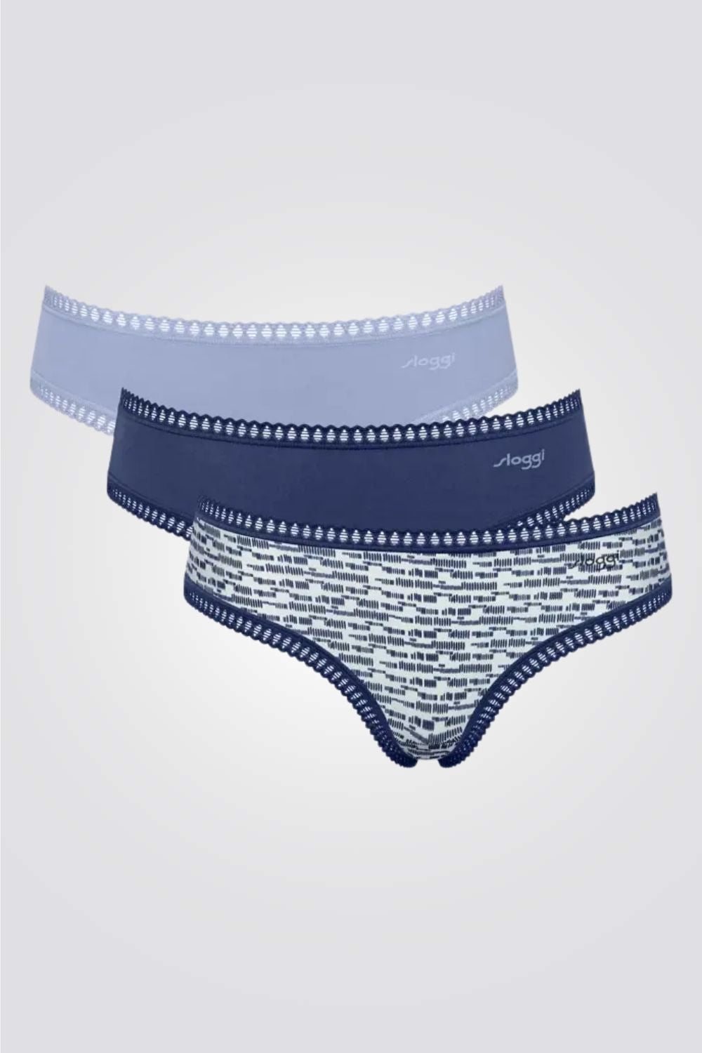 מארז שלישיית תחתונים מבית המותג SLOGGI בגזרת היפסטר בשלושה צבעים.מורכבים בעיקר מכותנה ובעלי עיטורי תחרה באיזור המותן והמפשעה.