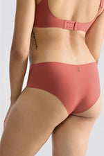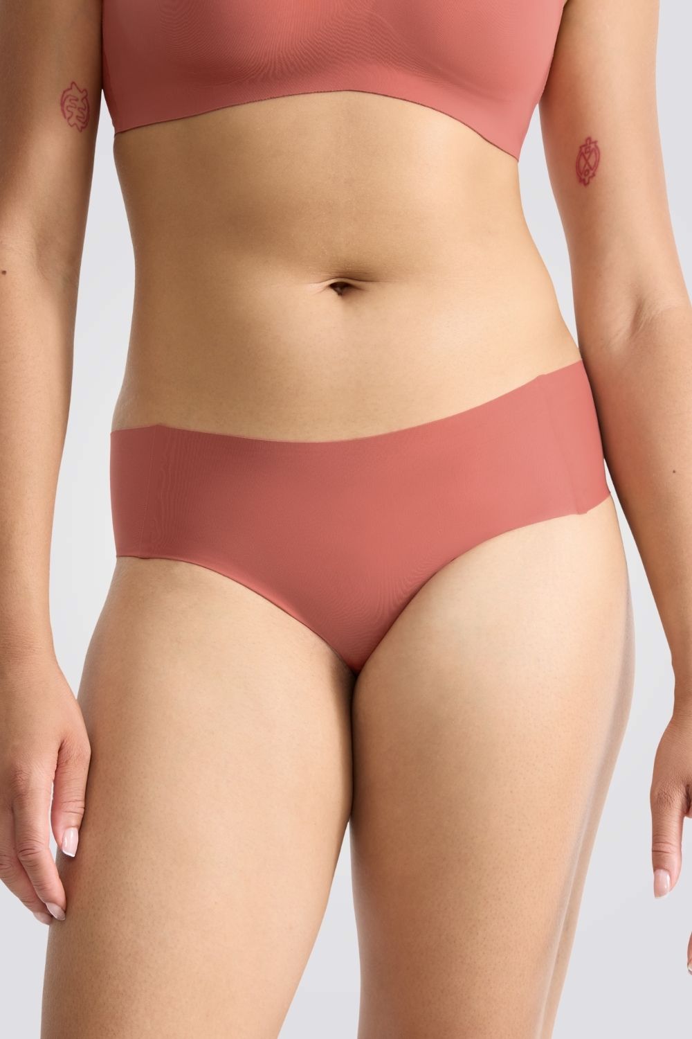 תחתוני היפסטר מבית המותג SLOGGI לנשים בצבע ורוד, ללא תפרים, קצוות בחיתוך חופשי ולוגו המותג מוטבע מאחור בצבע אפור.