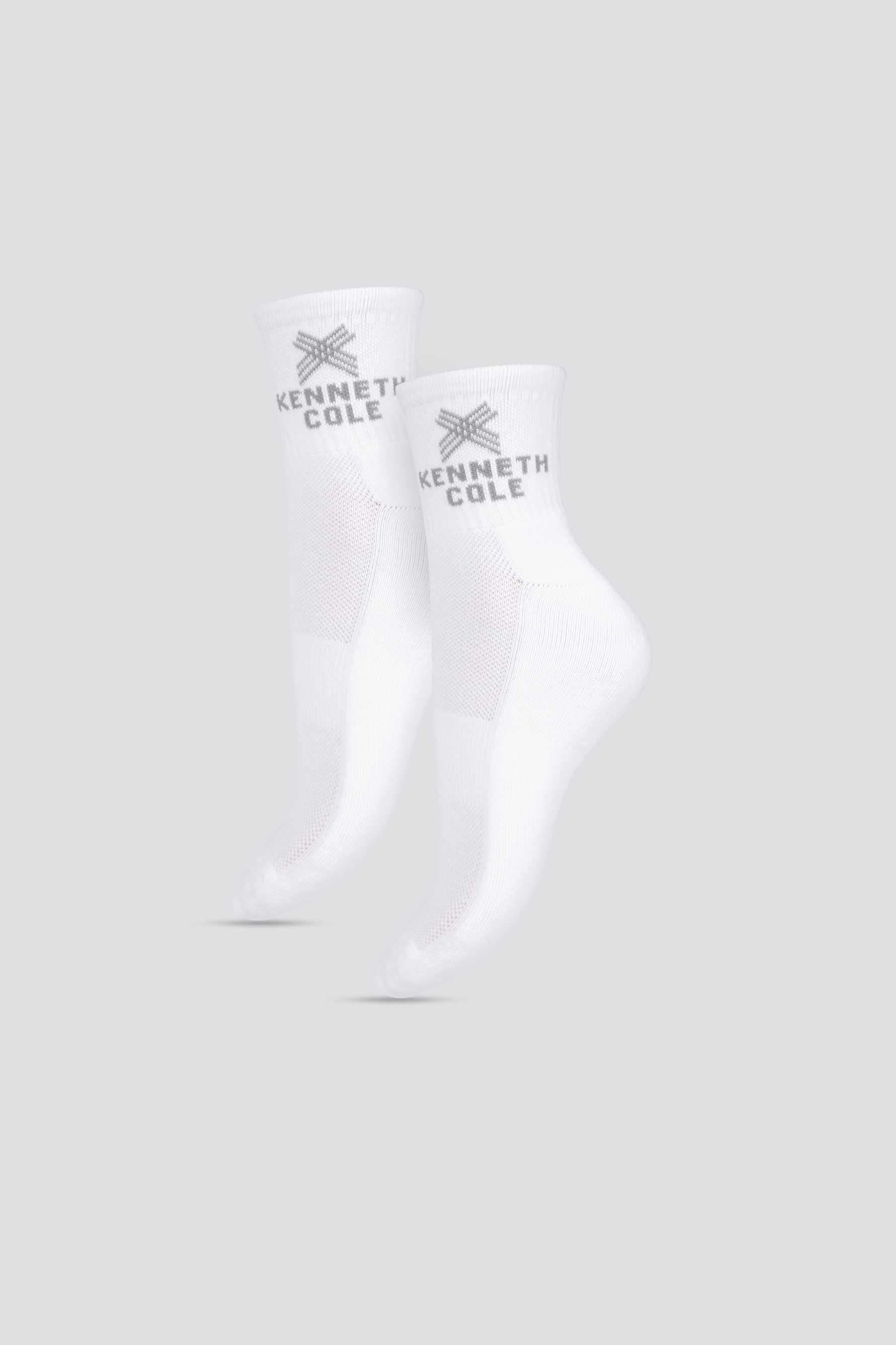 מארז גרבי ספורט לגברים מבית המותג KENNETH COLE בצבע לבן, הכולל 2 זוגות גרביים מרופדים בחלק התחתון, באורך קלאסי, עם הדפס לוגו בצדדים.
