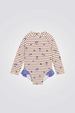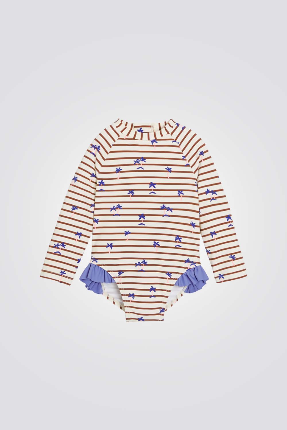בגד ים לתינוקות מבית המותג OBAIBI, עם הדפס צבעוני של פסים ועצי דקל , שרוולים ארוכים וסגירת רוכסן מאחורה.