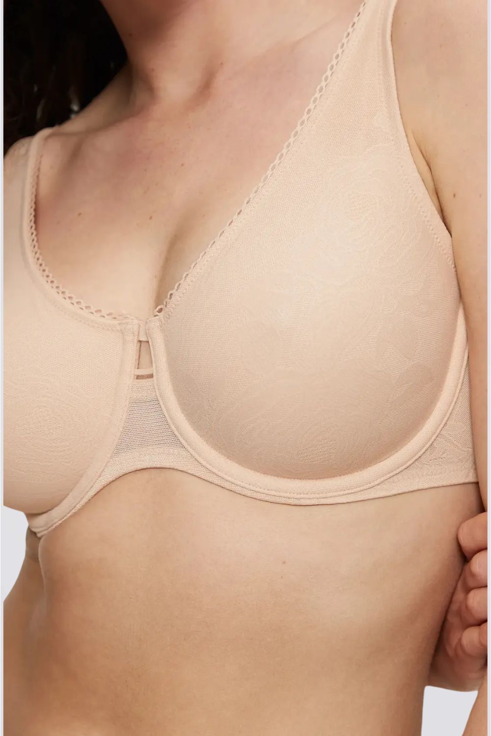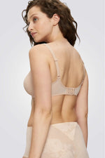 חזיית מינימייזר מבית המותג TRIUMPH במראה דו שכבתי מעודן של משחקי שקיפויות בשילוב דוגמת תחרה פרחונית. לחזייה קאפים רכים בעיצוב SPACER בריפוד מיוחד ונושם, עם ברזלים גמישים המתאימים את עצמם לתנועות הגוף, ובשילוב עם התחרה האלסטית מעניקים את אפקט המינימייזר עד מידה אחת פחות. החזייה במראה חלק, מעוצב ואלגנטי מתחת לבגדים, מושלמת למחשוף וי.