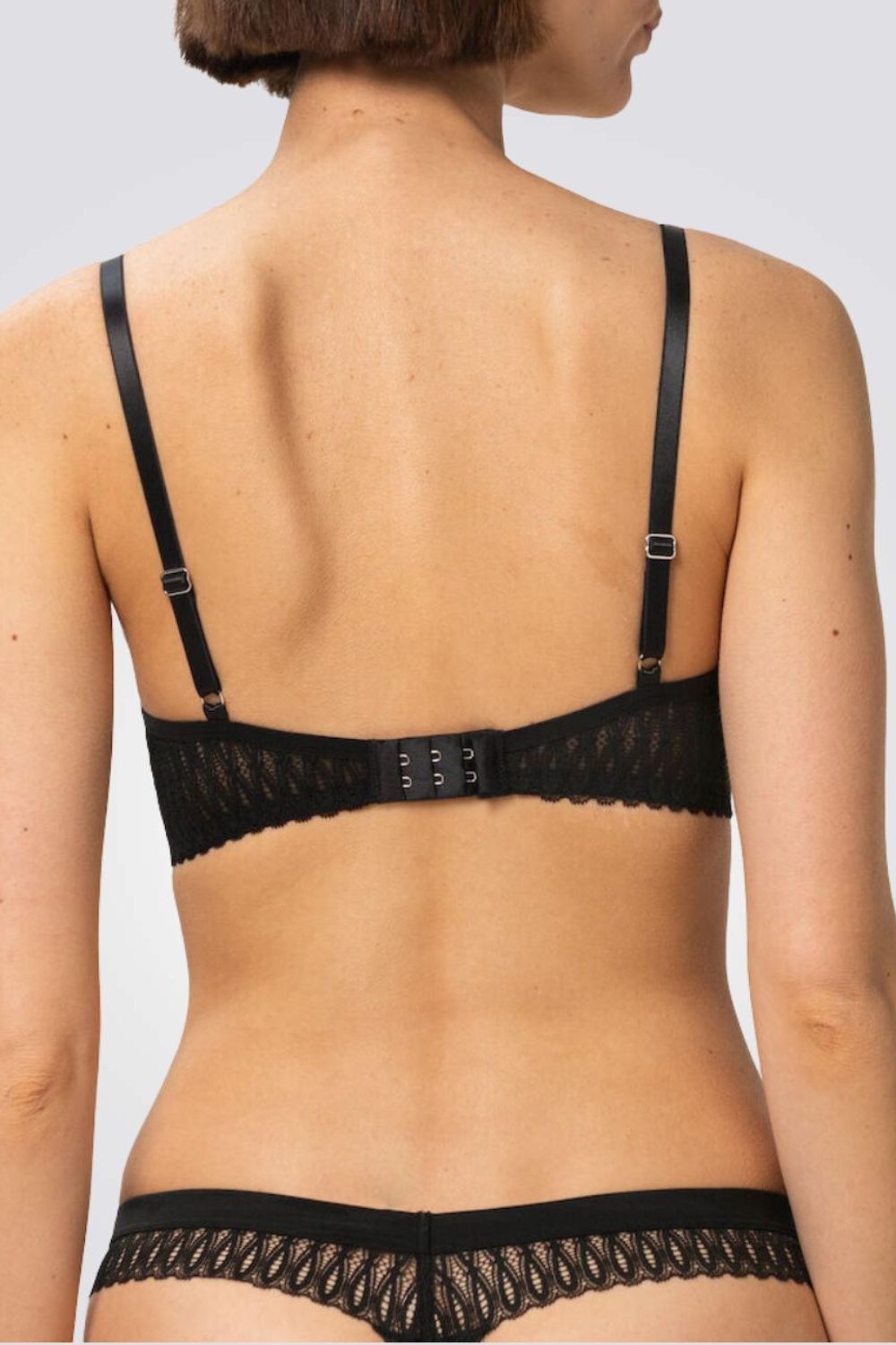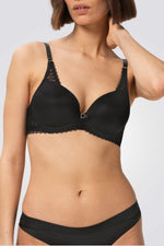 חזייה מרופדת מבית המותג TRIUMPH, בצבע שחור מרופדת קלות עם קשת ליצירת צורה טבעית, קאפים מבד עם פרטי תחרה מעוצבים ובעלת רצועות מתכווננות וסגירת וו עם שלושה מצבים