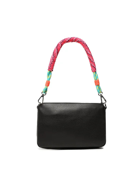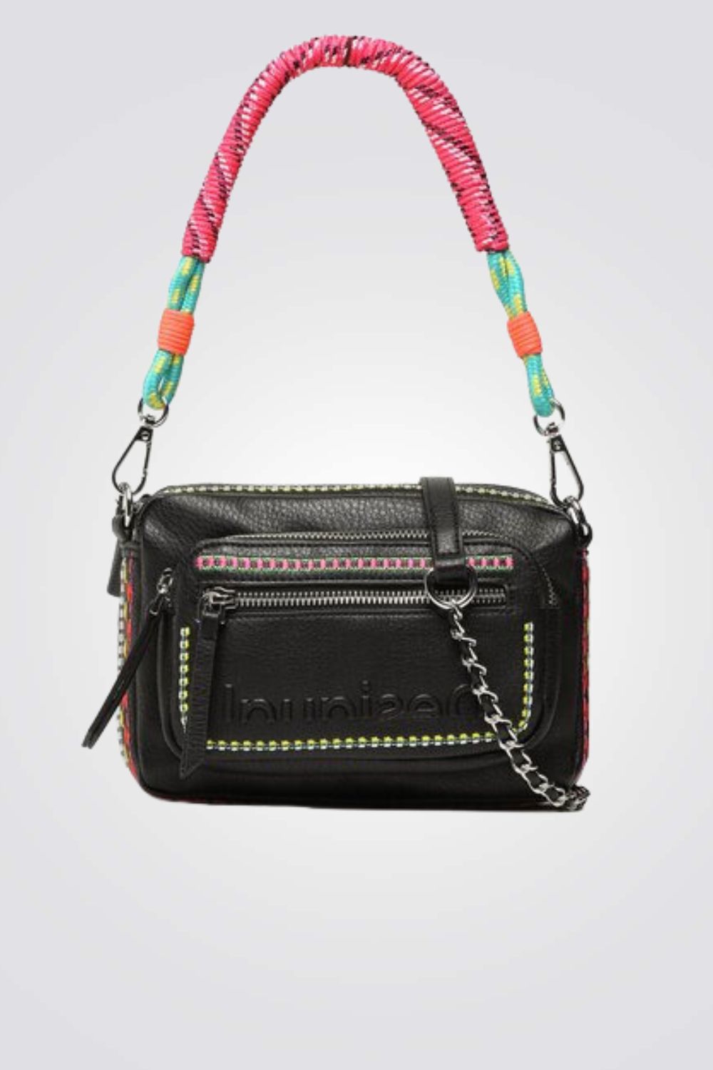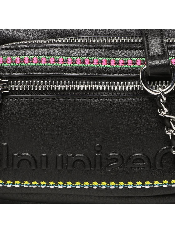 תיק צד מבית המותג DESIGUAL, תיק צד בעל רצועת כתף ארוכה מתכווננת, שתי ידיות נשלפות ורקמה ססגונית בסגנון אתני, מספר כיסים חיצונים ופנימיים, בעל סגירת רוכסן ושני תאים בתוספת ידית חבל קלועה קצרה לנשיאה ביד