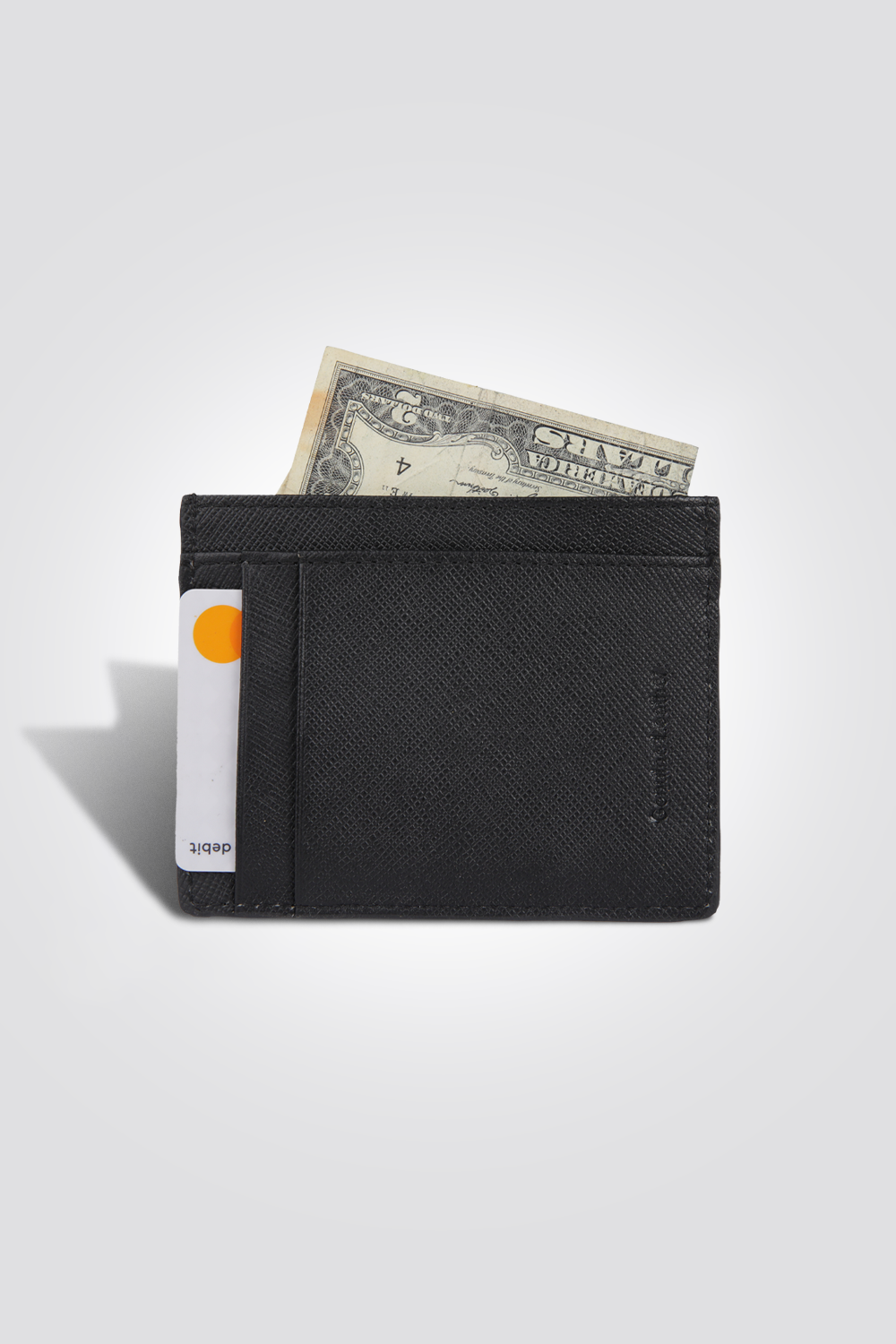 ארנק איכותי וקומפקטי מעור מחוספס מבית המותג KENNETH COLE בסגנון פתוח בצבע שחור עם 5 תאים שמתאימים לכרטיסי אשראי/כרטיסי ביקור (2 תאים מקדימה ו - 3 תאים מאחור) ותא ייעודי לשטרות מקופלים למעלה.