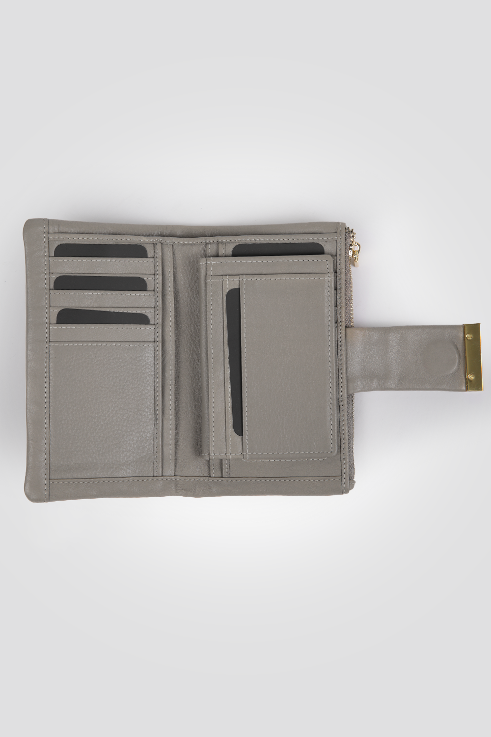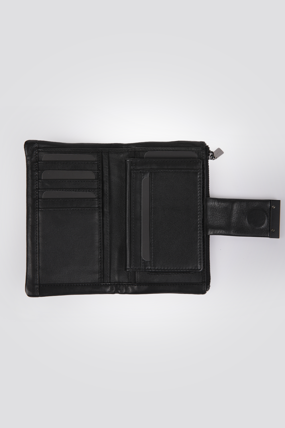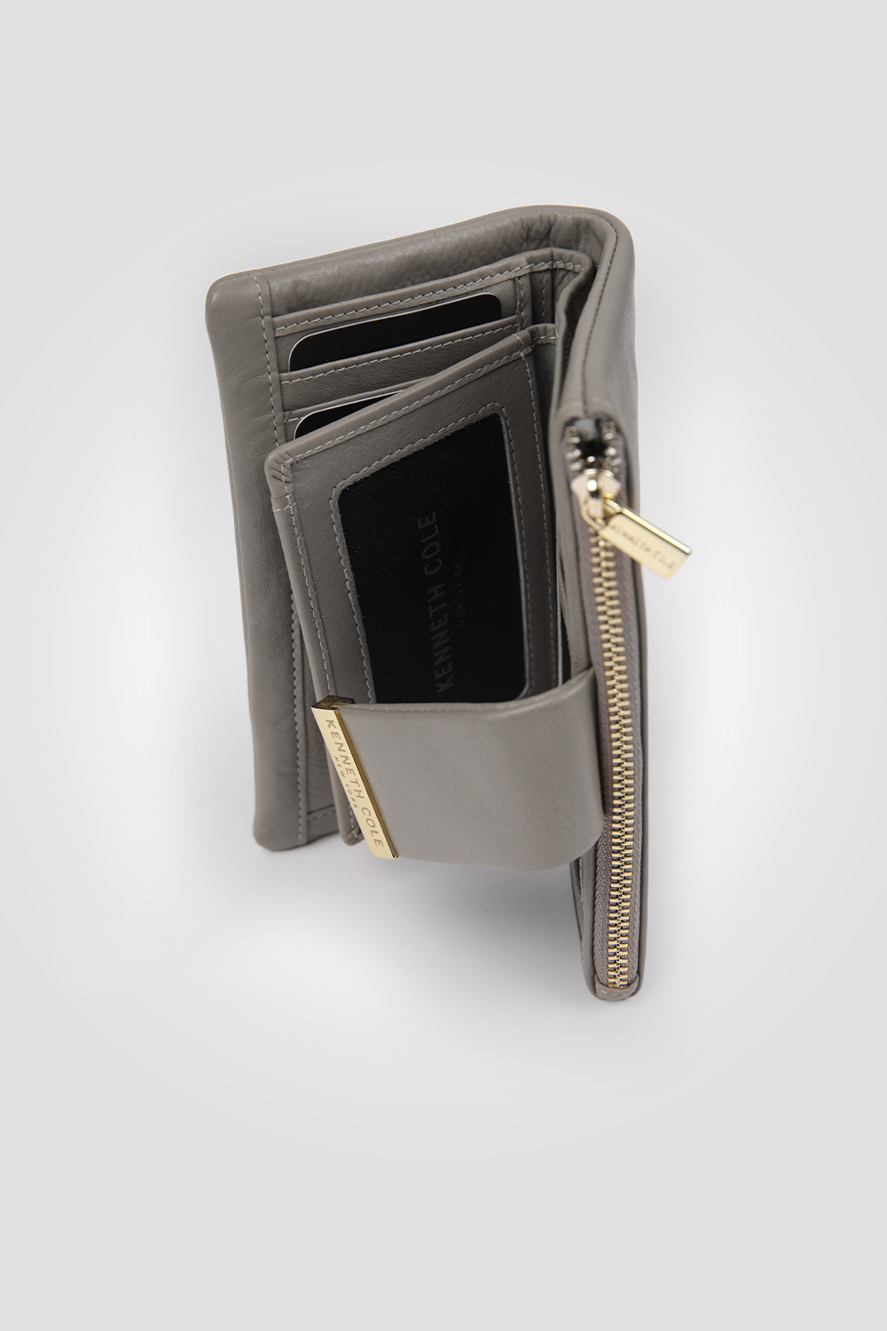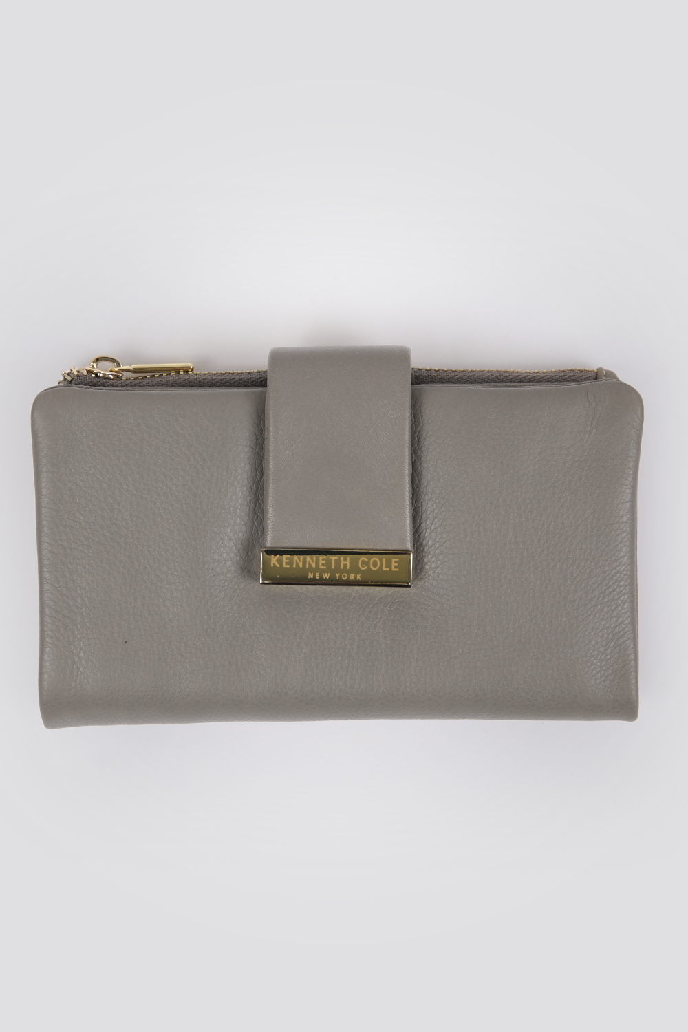 ארנק עור מבית המותג KENNETH COLE עם תאים לכרטיסים, תא פנימי פתוח לאחסון ותא חיצוני עם סגירת רוכסן, בעל סגירת מגנט ראשית.