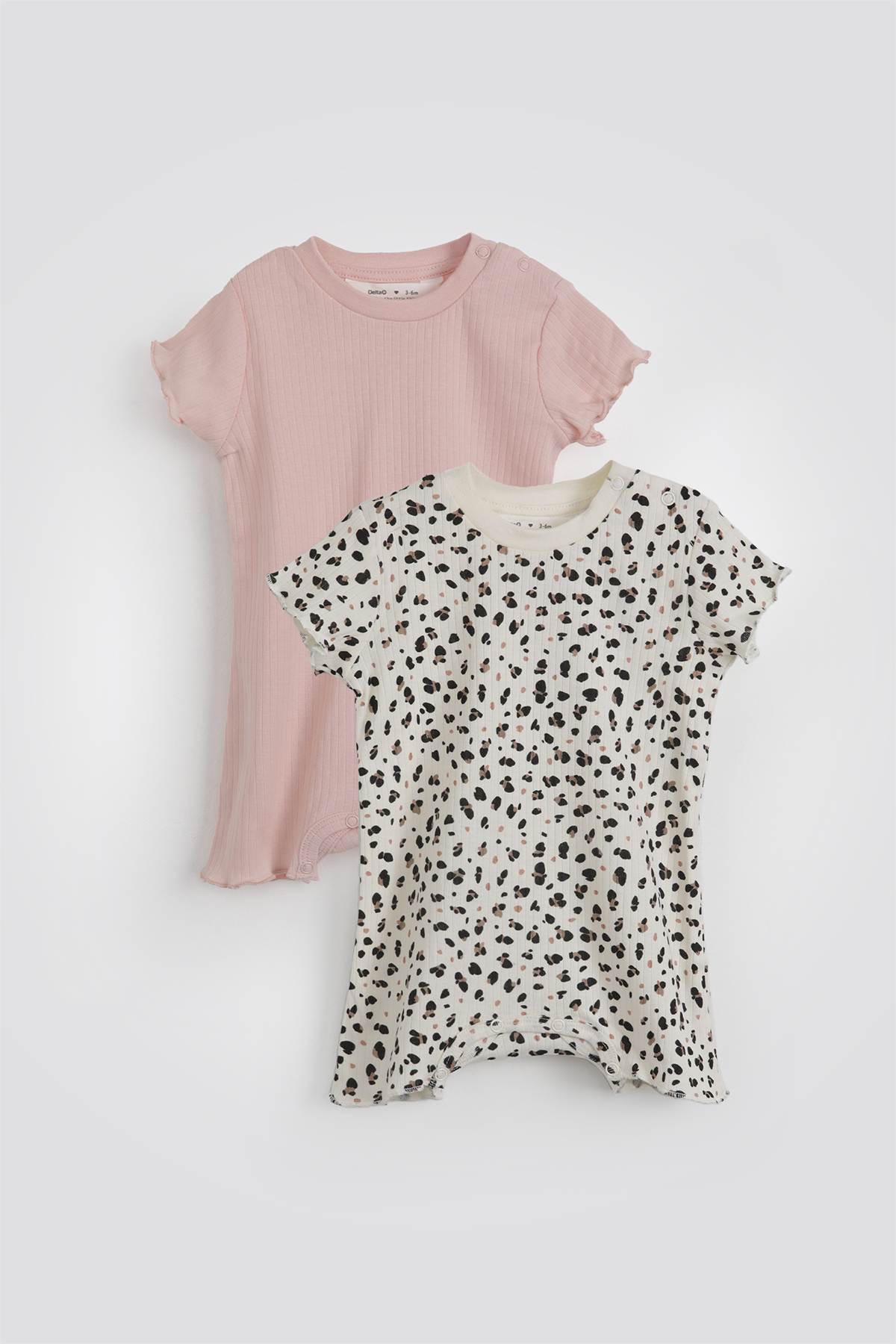 שני אוברולים קצרים לתינוקות מבית המותג DELTA העשויים מבד בטקסטורת ריב נעימה עם צווארון עגול, שרוולים קצרים, סוגרי תיק-תק בתחתית ובכתף וסיומת מסולסלת בשרוללים וברגליים.