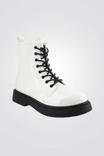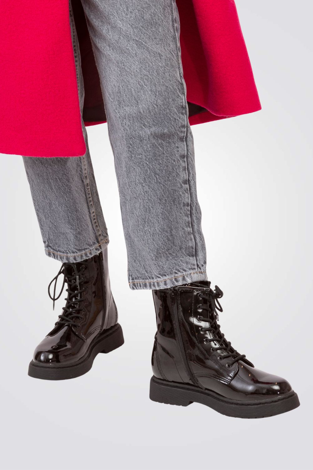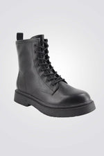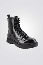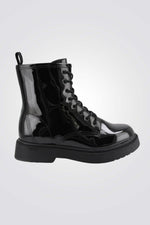 מגפיים מבית המותג SEVENTYNINE בגימור לקה, עם שרוכים וסגירת רוכסן בחלק הפנימי, בעלי סוליה עבה המתאימה לימי החורף.